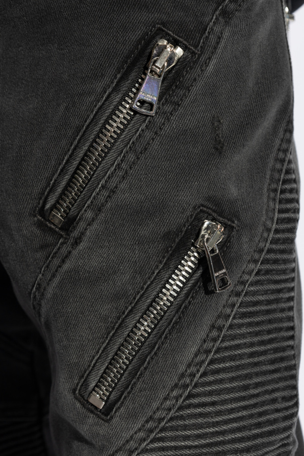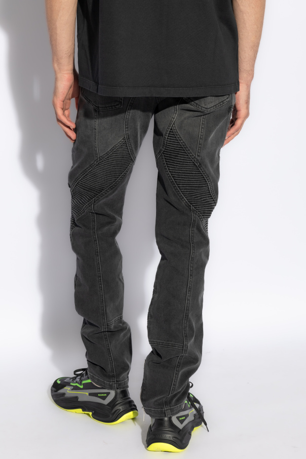 Introducing the epitome of sartorial elegance from the distinguished house of Balmain: the exclusive Logo Jeans in a sophisticated shade of grey. These meticulously crafted jeans merge classic aesthetics with the audacity of modern design, offering an unparalleled statement piece for the discerning wardrobe. The jeans boast a classic, fitted silhouette with a lower rise, designed to accentuate your physique with straight legs that hint at timeless sophistication. Crafted from a resilient blend of 97% cotton and 3% elastane, this fabric offers both durability and a slight stretch, conforming to your body for the ultimate fit and comfort. Distinguished by their motorcycle-inspired quilting, featuring diamond and horizontal line patterns along the knees and legs, these jeans exude an edgy allure. Metal zippers strategically placed on the thighs and pockets not only serve as chic embellishments but also introduce practicality with additional compartments. While the designer\'s logo remains discreet, echoing Balmain\'s penchant for minimalism, it\'s the thoughtful details—like the subtle placement on buttons and inner tags—that reaffirm the exclusivity of these jeans. With a zip and snap closure and ample pocket space, these jeans blend functionality with luxury. Why Purchase These Jeans? Elegant design with a modern twist, perfect for upscale casual wear. High-quality material ensures durability and comfort. Functional details, such as multiple pockets and practical zippers, enhance utility. Exquisite craftsmanship and subtle designer branding underscore the luxury status.