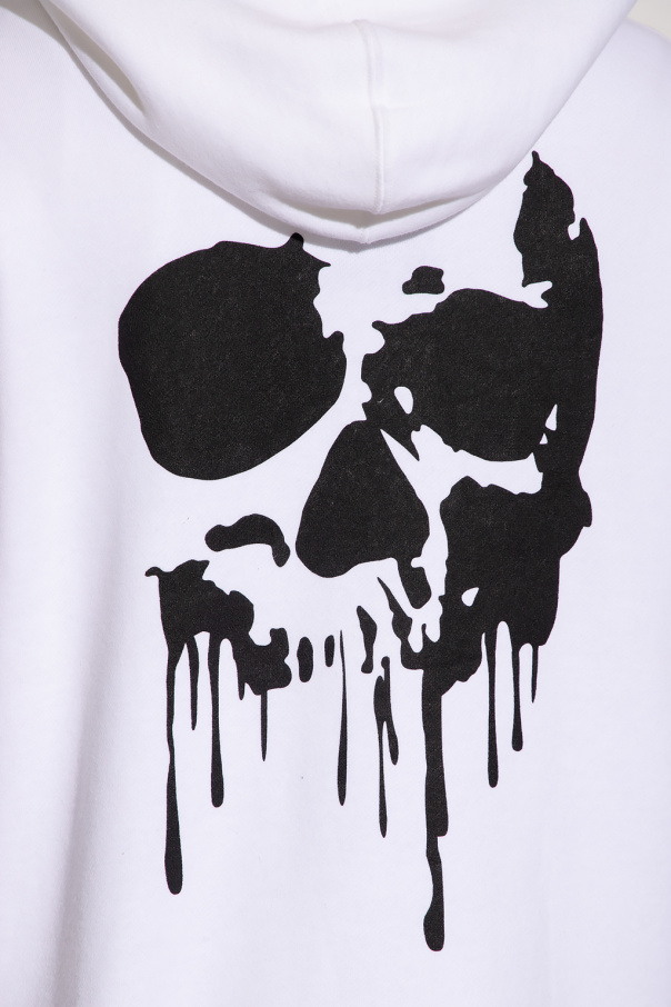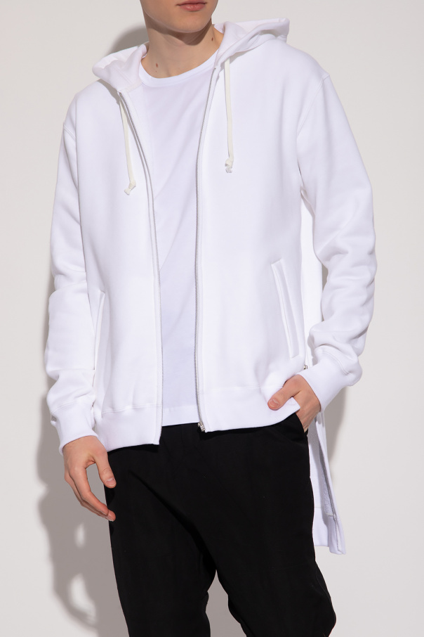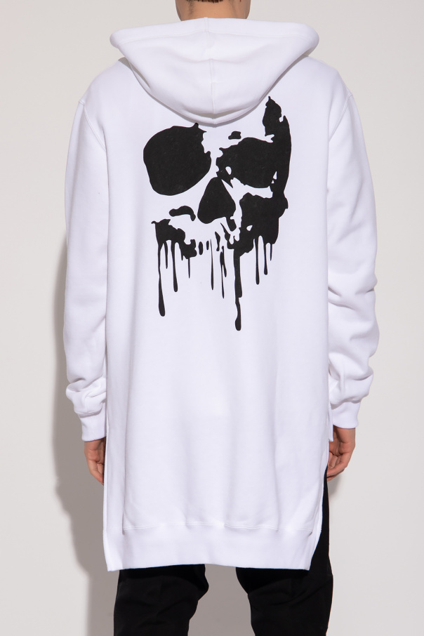 White asymmetric sweatshirt from Comme des Garcons Homme Plus. Made of cotton. Fastened with a zip, this garment features a hood with drawstrings, two front pockets, zip closure on the side, black print at the back and ribbed trims at the hem and cuffs.