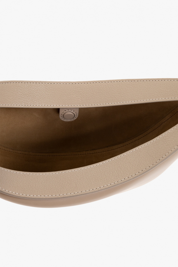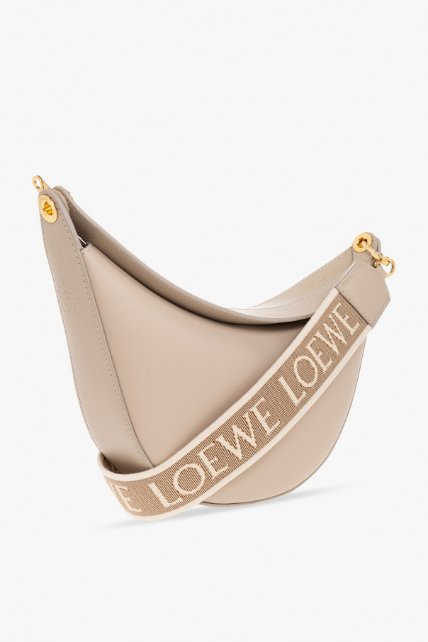 Greyish beige ‘Luna Small’ shoulder bag from Loewe. Crafted from calf leather, this design secures with a magnetic snap and showcases an embossed logo, a detachable shoulder strap with an embroidered logo, gold-tone metal hardware and one internal compartment.