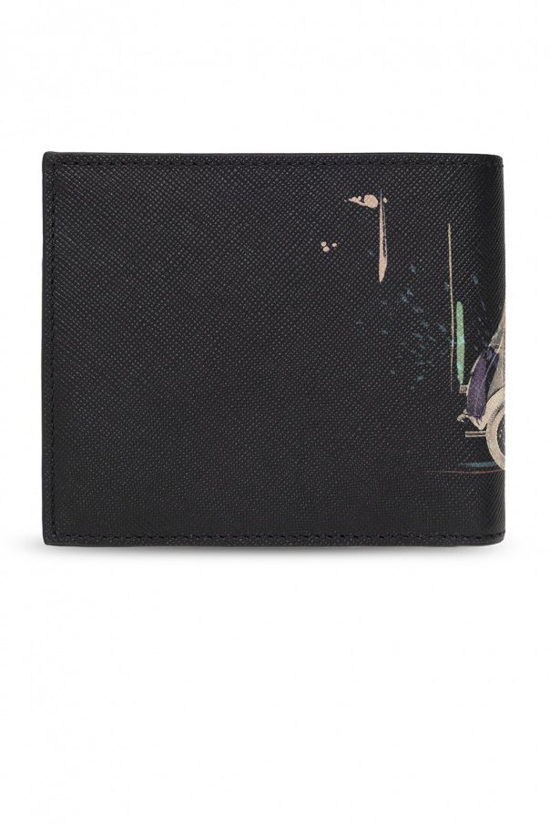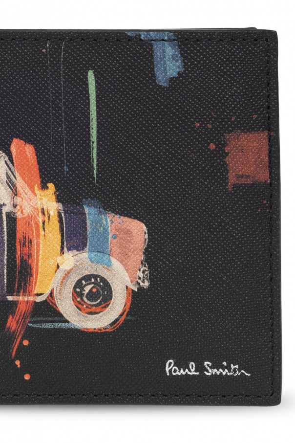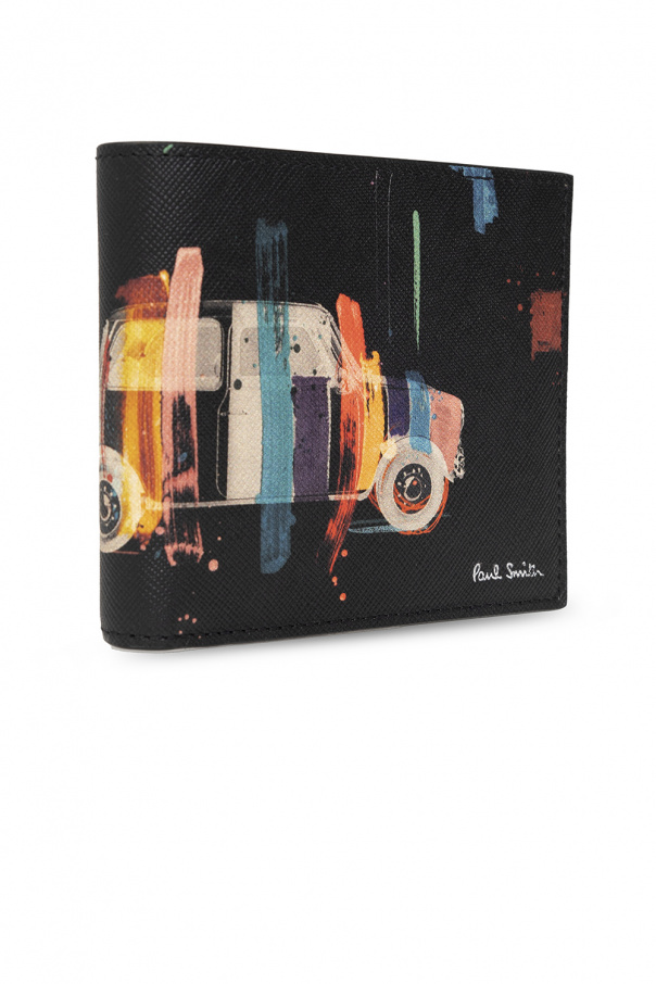Black folding wallet from Paul Smith. Made of leather, this design is decorated with a multicolored print and silver-tone embossed logo. It has a bill compartment, two snap-fastened coin pockets, two slip pockets and four card slots.