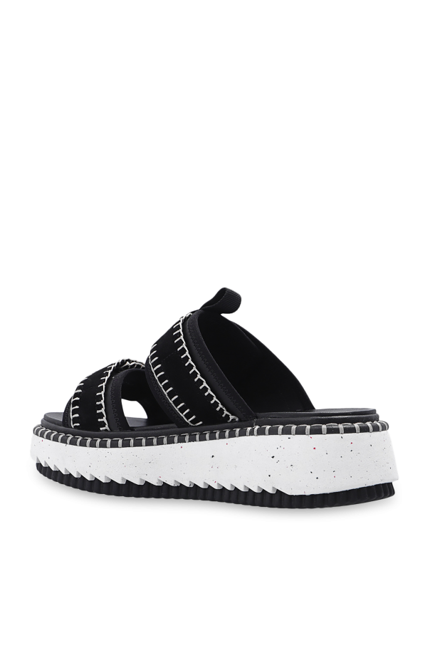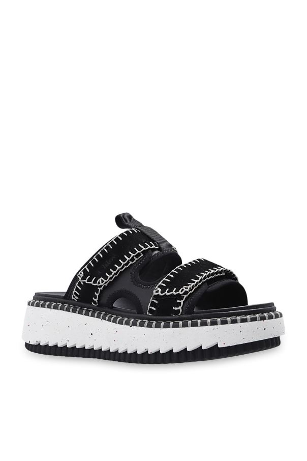 Black ‘Lilli’ platform slides from Chloé. Crafted from calf leather with fabric trims, this pair features a velcro closure, decorative light grey stitching details, logo detail and light sole made of recycled rubber in black and white.