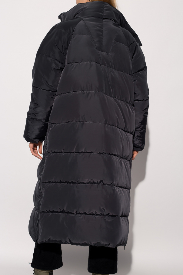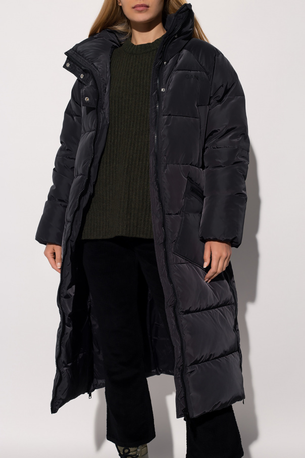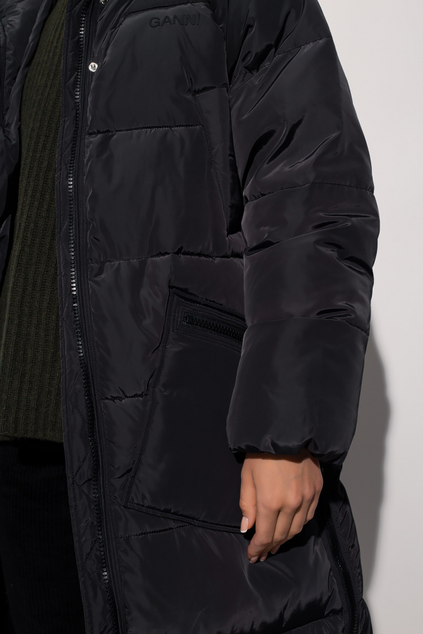 Black down coat with a high neck from Ganni. Fastened with a zip and snaps, this garment features a brown logo pattern, two zip pockets, two snap-fastened pockets, decorative zips at the hem and long sleeves with ribbed cuffs.