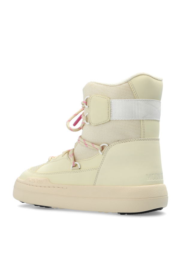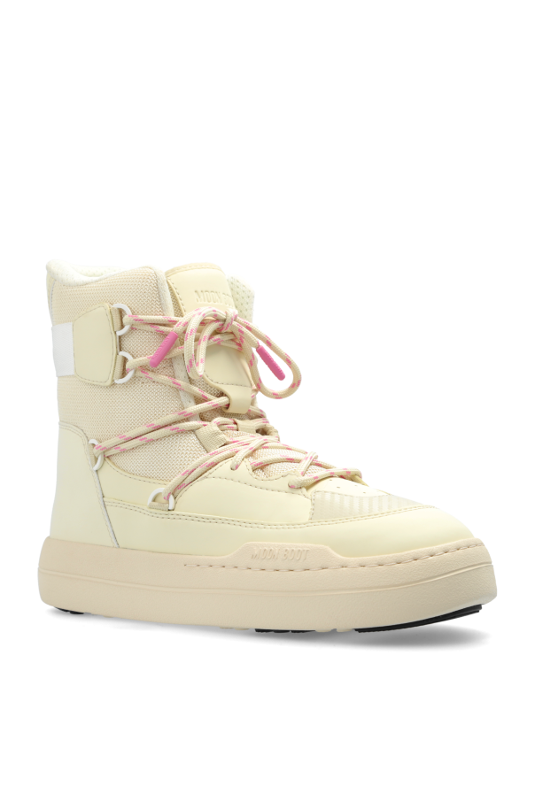 Introducing the exquisite Park Sneaker Boot from the renowned brand Moon Boot, an epitome of elegance and functionality in the realm of women\'s snow boots. These luxurious boots feature a high shaft extending above the ankle, providing unparalleled stability and protection in harsh winter conditions. The dominant cream color imbues the boots with an elegant and pristine appearance, accentuated by delicate pink and white laces that add a touch of subtle charm. Crafted from premium materials, likely a combination of leather and fabric, these boots promise durability and comfort. Inside, the boots are lined with a material designed to provide warmth and coziness, ensuring your feet remain comfortable even in the coldest weather. A wide decorative or stabilizing strap graces the side of the shaft, while the brand\'s name, MOON BOOT, is embossed on the lower part of the shaft and the sole, affirming the authenticity and exclusivity of the product. The robust rubber sole offers excellent traction on slippery surfaces, and the well-padded interior suggests a high level of comfort for prolonged wear. The lace-up closure allows for a customized fit, enhancing both comfort and functionality. Why choose the Park Sneaker Boot? Elegant Design: Cream color with pink and white laces for a sophisticated look. High-Quality Materials: Durable and comfortable leather and fabric construction. Warmth and Comfort: Lined interior to keep your feet warm. Excellent Traction: Robust rubber sole for stability on slippery surfaces. Authenticity: Embossed brand name confirming the exclusivity of the product.