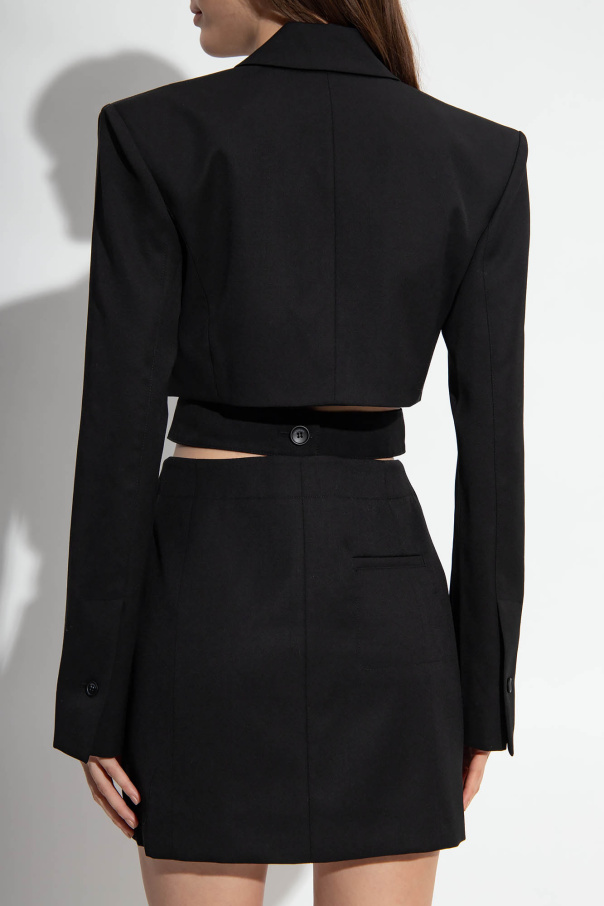Black ‘Bari’ dress from Jacquemus. Made of virgin wool. Fastened with buttons, this design features a decorative cut-out, buttoned tab at the back, two slip pockets, notch lapels and long sleeves with buttoned cuffs.
