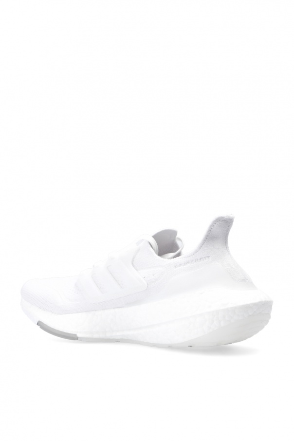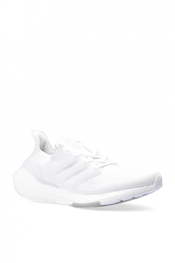 White ‘UltraBOOST 21’ sneakers from ADIDAS Performance, the ‘Primeblue’ line. Featuring a Primeknit+ upper, this lace-up design features a logo appliqué on the tongue, the iconic three stripes on the sides and a white Stretchweb Continental™ rubber sole with 6% more Boost capsules and the new Torsion System, which provides a 15% increase in forefoot bending stiffness for a more responsive run. Primeblue is a performance fabric made with Parley Ocean Plastic, which is created from recycled plastic waste intercepted from beaches and coastal communities before it reaches the oceans. Products made of Primeblue contain a minimum of 40% recycled material in total.