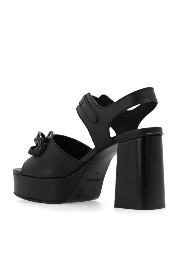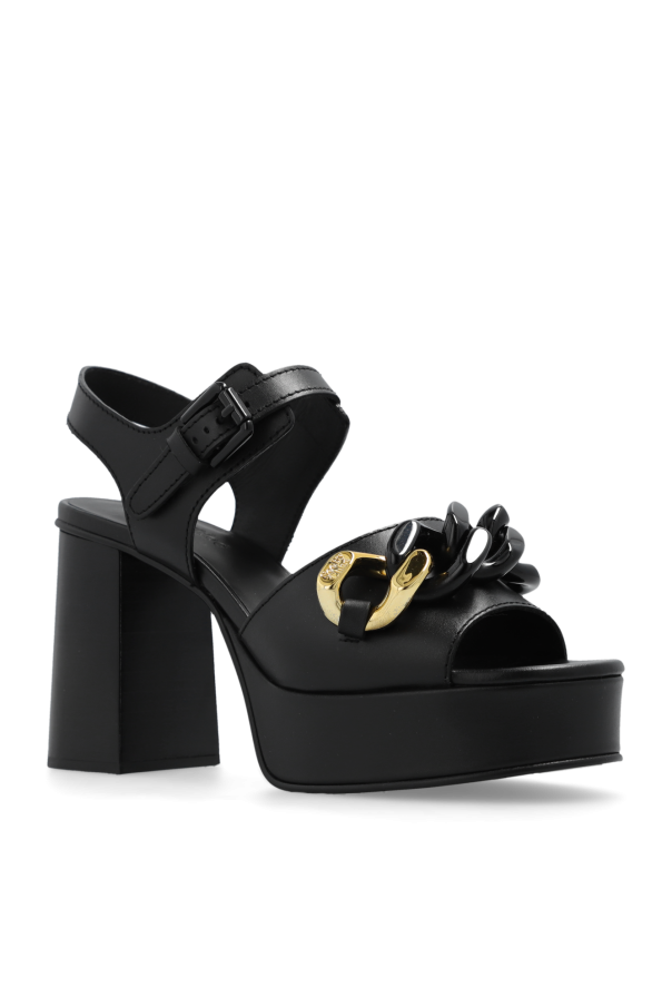 Black ‘Monyca’ platform sandals from See By Chloe. Made of leather, this pair features an adjustable buckled ankle strap, chain with a decorative gold-tone chain link engraved with a logo, rounded toe, chunky heel and black rubber sole.