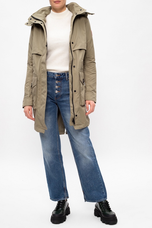 Green ‘Cavalry’ coat from Canada Goose. Fastened with a two-way zip and snaps, this design features a detachable hood, two flap pockets with decorative buttons, a slit at the back and a drawstring hem. Temperature rating: 5/-5°C.