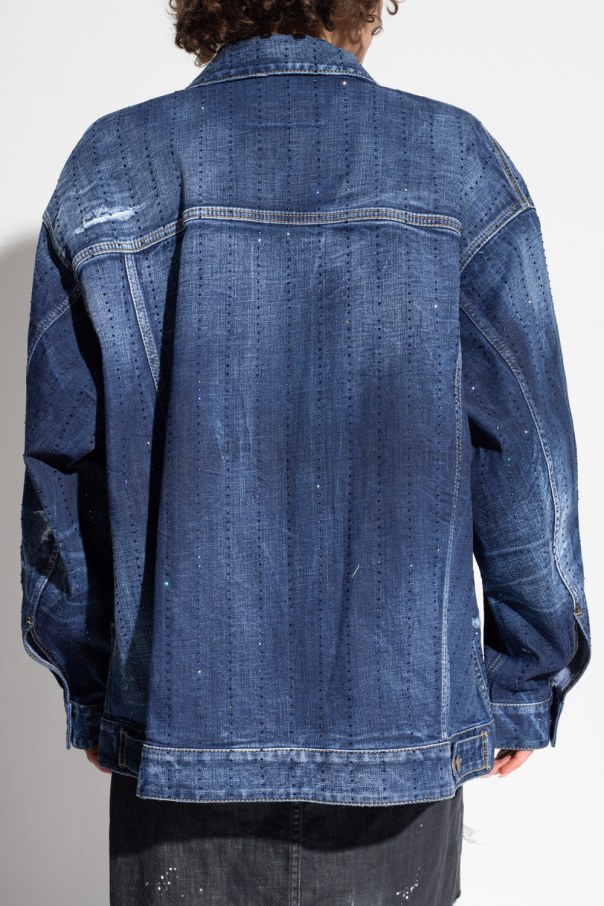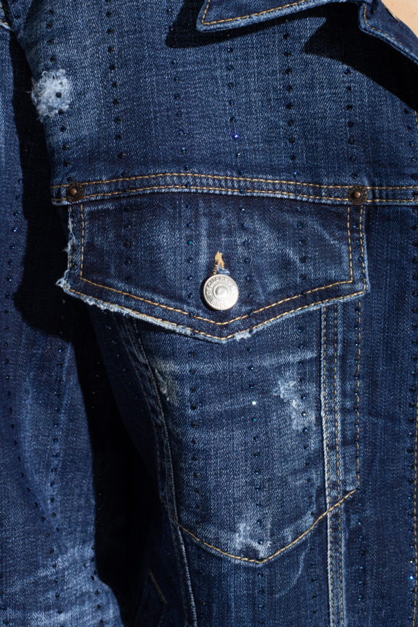 Navy blue denim jacket from Dsquared2. Made of cotton with a vintage effect, this style features rhinestone inserts, button closures, long sleeves, two welt pocket and two flapped pockets.