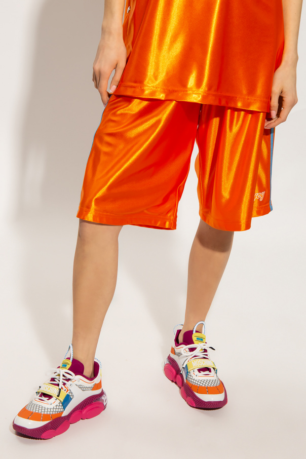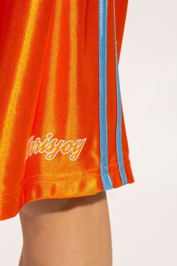 Orange shorts from Khrisjoy. Crafted with a shimmering finish, this pair features a printed logo, a drawstring waistband, two slip pockets and blue panels down the sides.