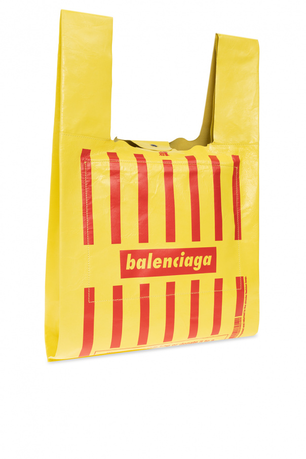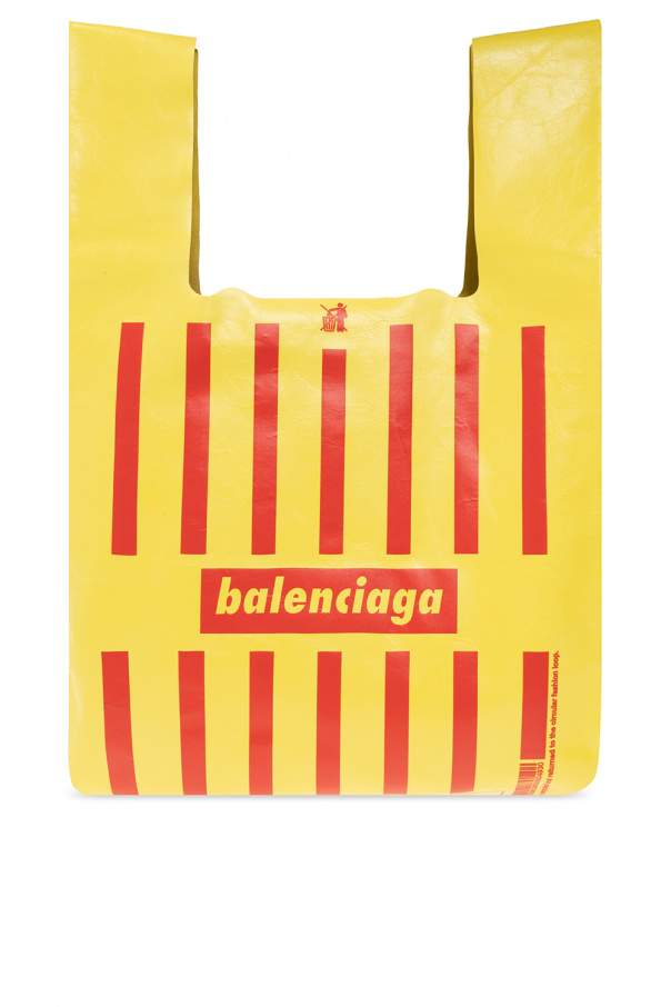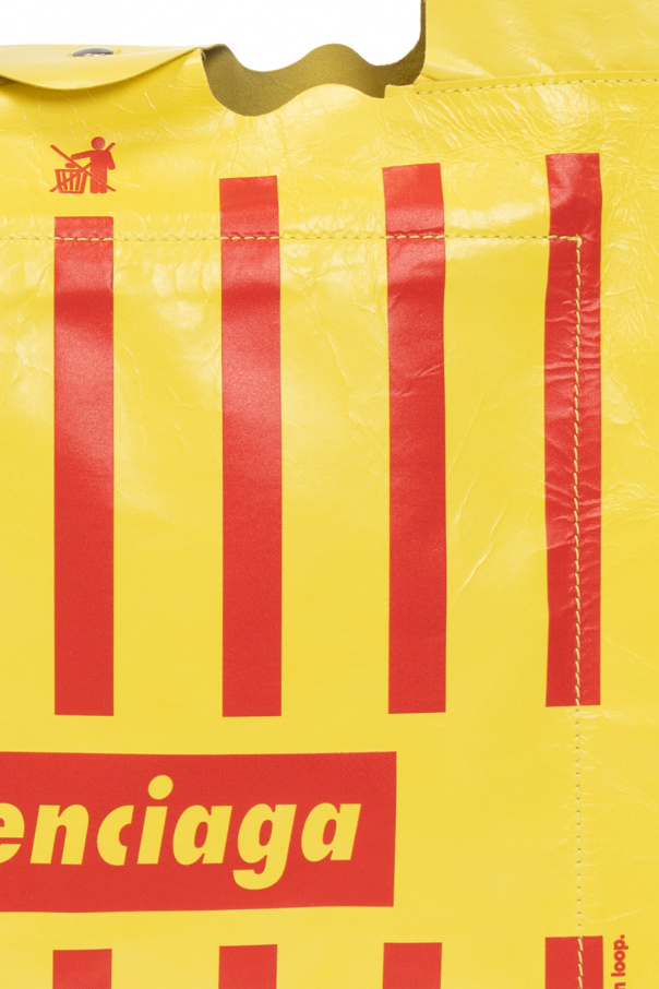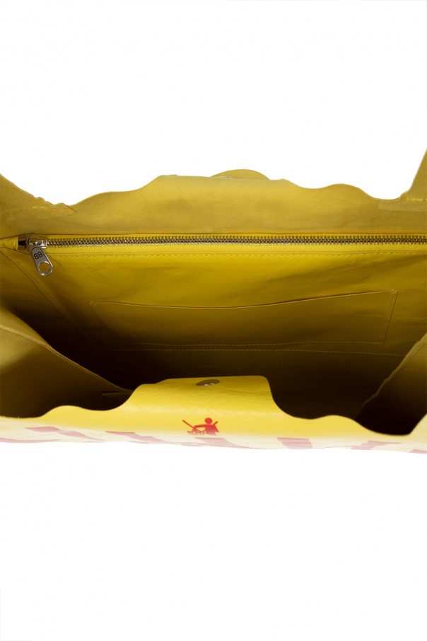 Yellow ‘Monday’ shopper bag from Balenciaga. Crafted from calf leather, this model features a snap closure, red logo pattern, two half-round handles, silver-tone metal hardware and one internal compartment with one zip pocket and one slip pocket.