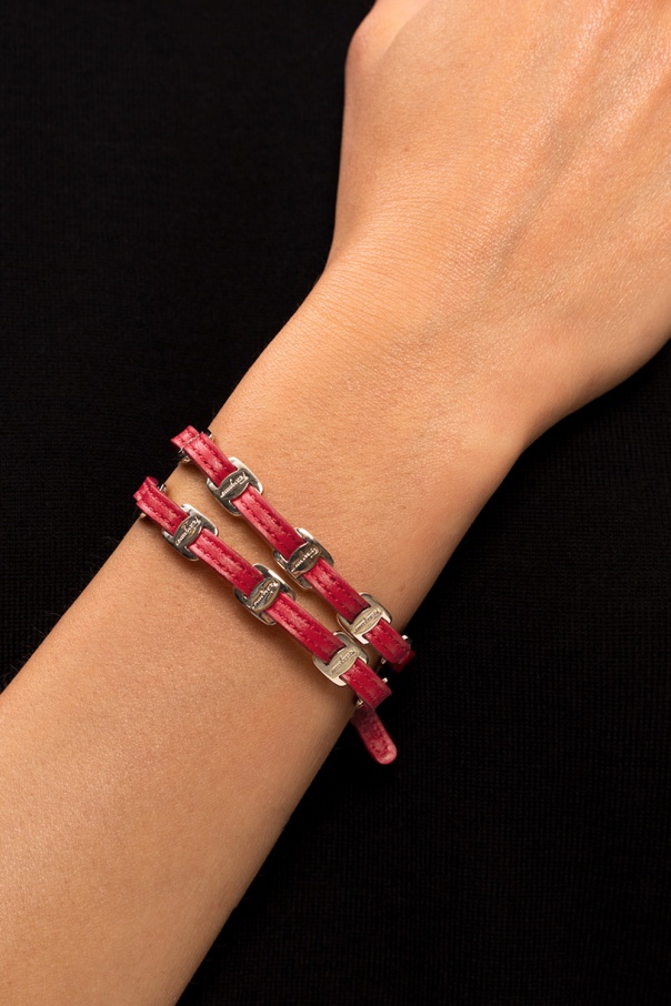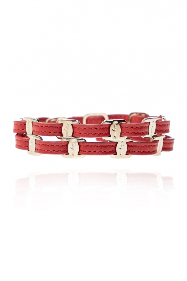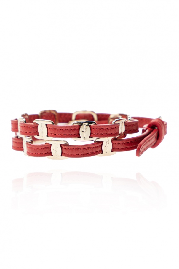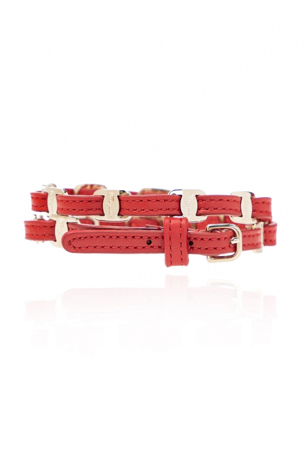 Red bracelet from Salvatore Ferragamo. Crafted from calf leather, this accessory has buckle fastening and logo-embossed brass appliqués in silver-tone.