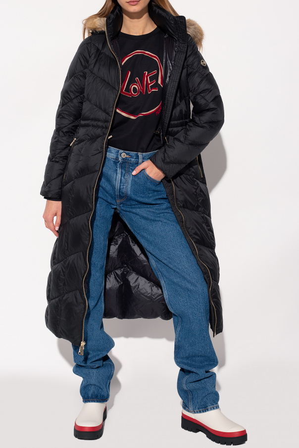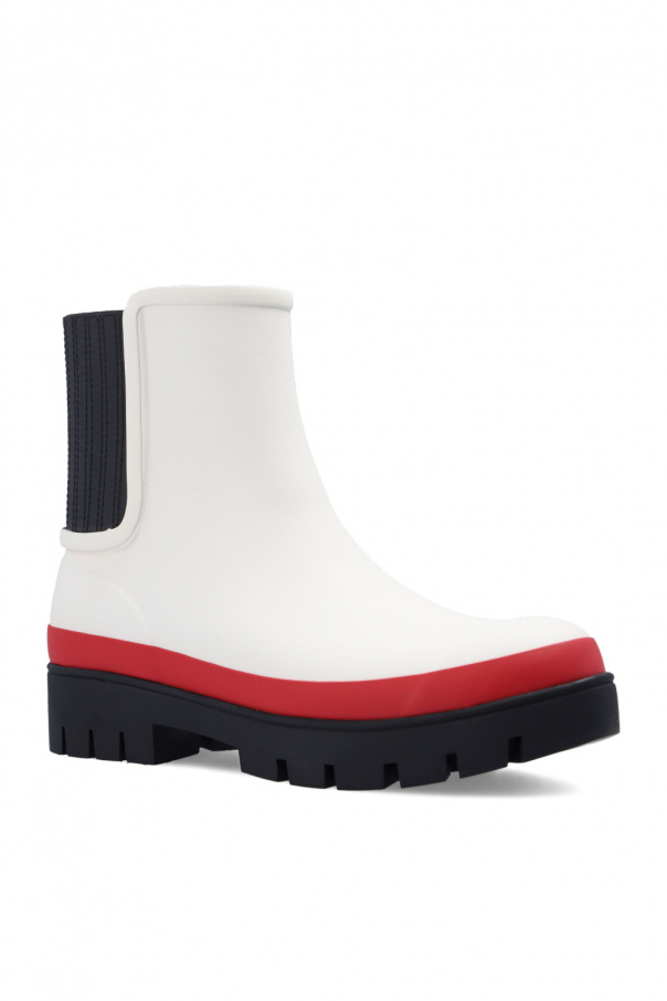 Cream, black and red rain boots from Tory Burch. Made of rubber, this pair is decorated with a raised logo and rests on a black rubber sole.
