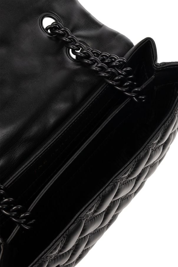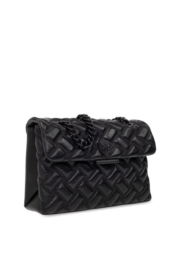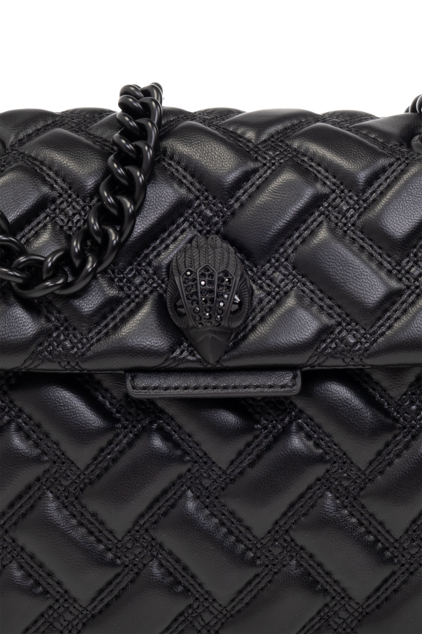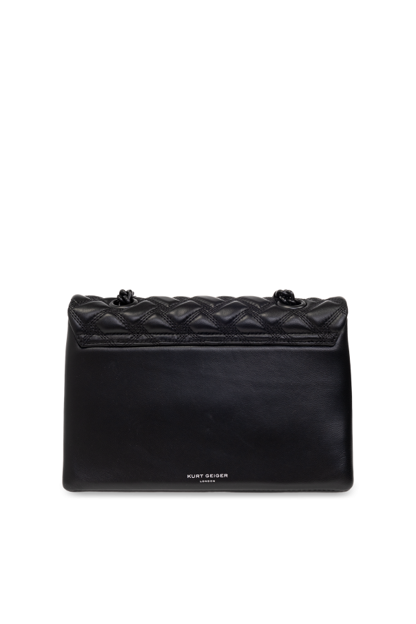 Black ‘Kensington Drench’ quilted shoulder bag from Kurt Geiger. Made from lamb leather, this design secures with a magnetic snap and showcases the brand\'s signature black Eagle head accompanied by a white logo print. It is complete with a double chain shoulder strap, black metal hardware and one internal compartment with a slip pocket.