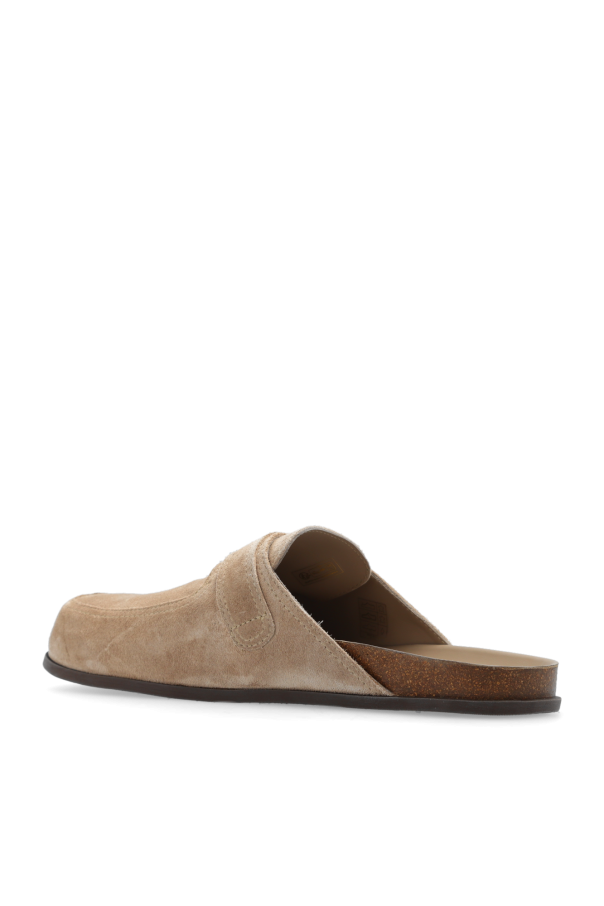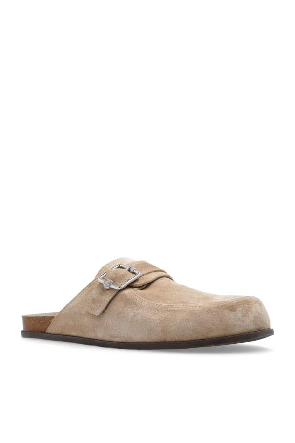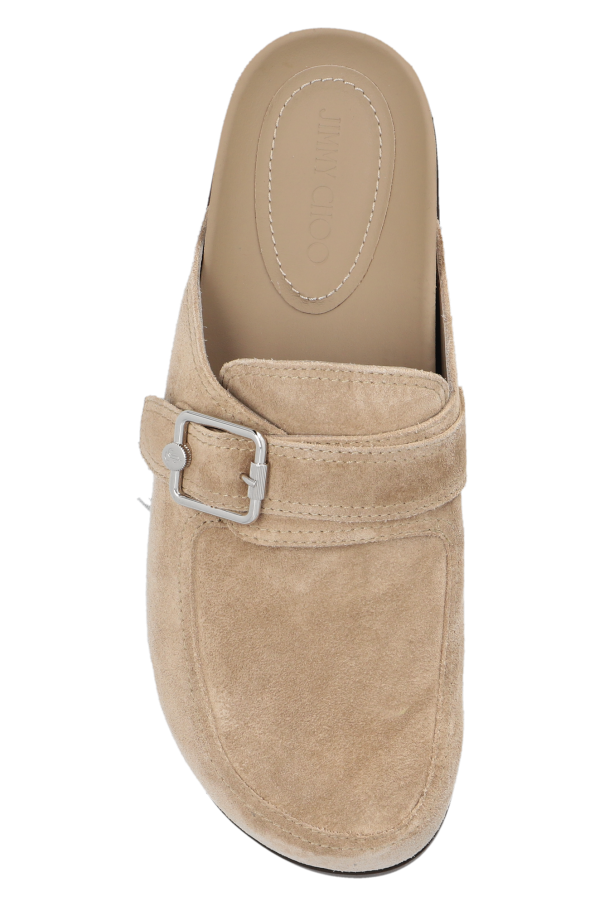 Greyish beige ‘Etta’ slides from Jimmy Choo. Made of suede, this design features a strap with a logo-engraved buckle in silver-tone as well as a brown cork sole with rubber trims.