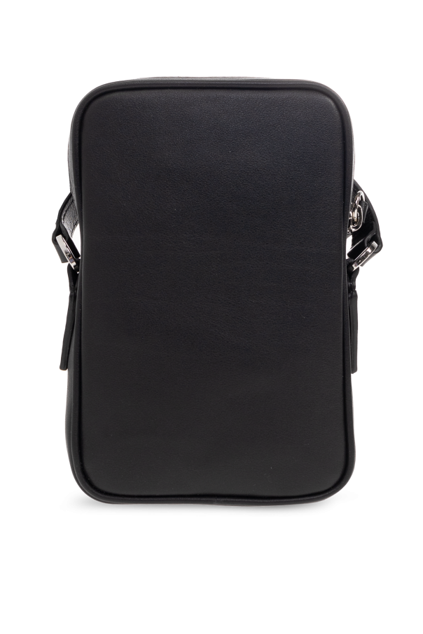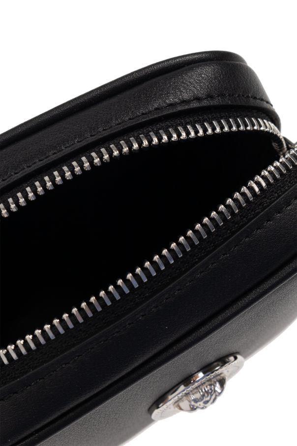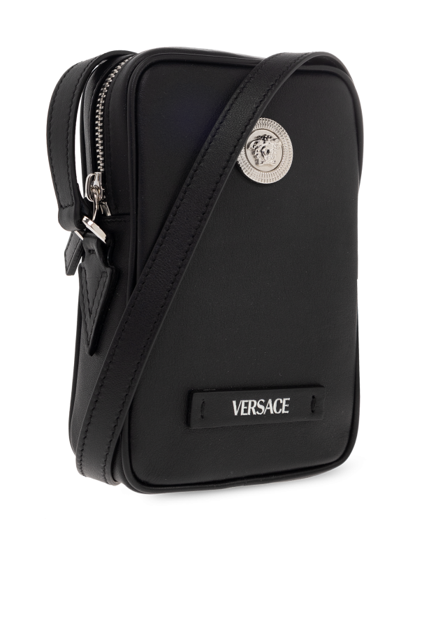 Black shoulder bag from Versace. Made of leather, this design fastens via a zip and showcases a logo patch accompanied by a signature Medusa face emblem on the front. It is complete with a long and adjustable strap, silver-tone metal hardware and one internal compartment.
