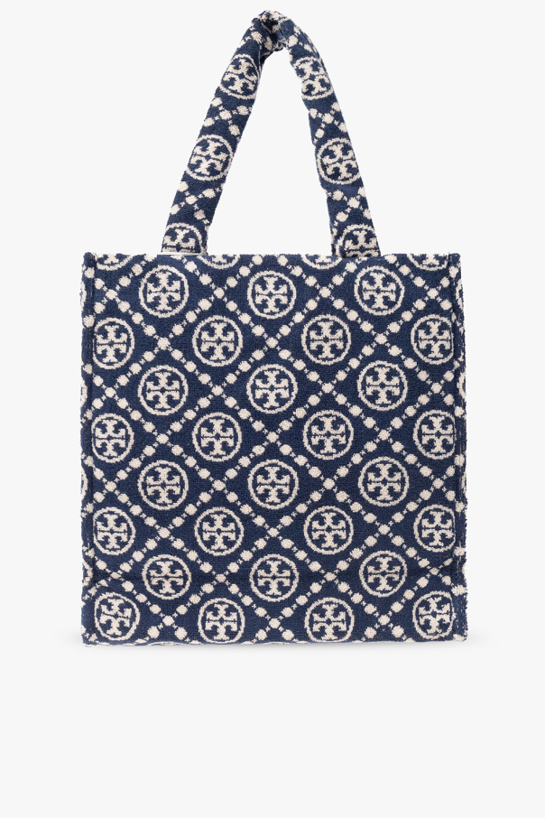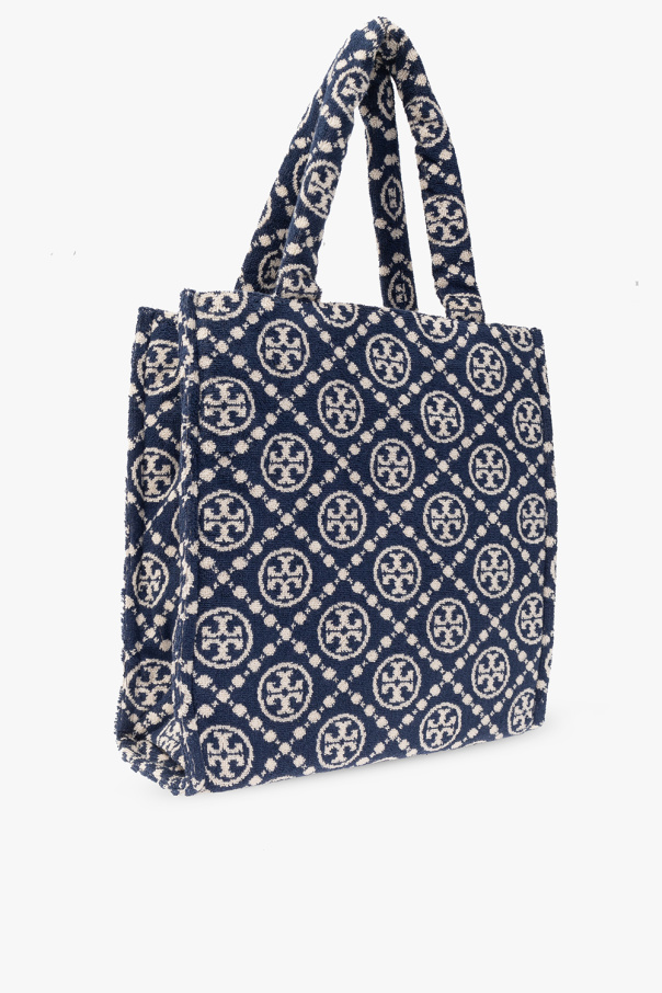 Navy ‘Terry’ shopper bag from Tory Burch. Crafted from terry cotton, this design features a cream monogram pattern, two half-round handles and one internal compartment with one zip pocket.