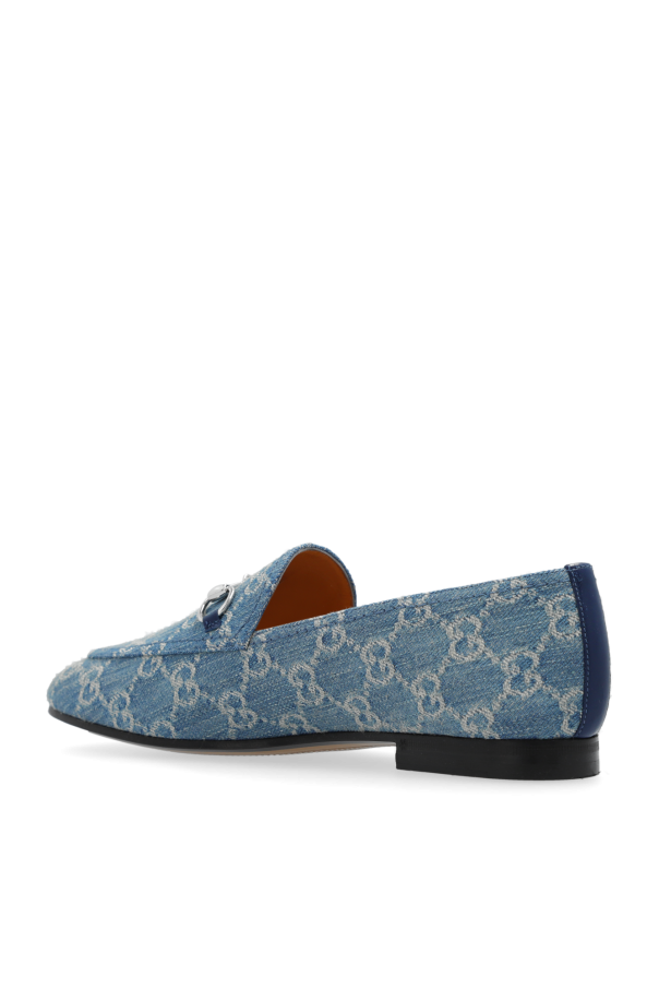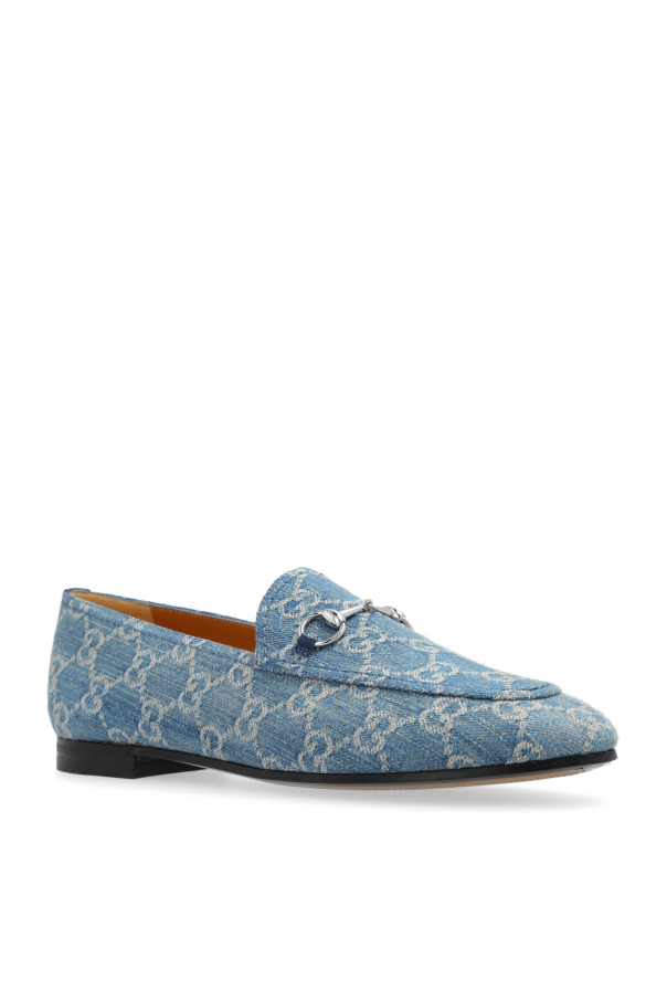 Blue ‘Jordaan’ loafers from Gucci. Made of denim with a light beige GG pattern and leather trims, this pair features a metal horsebit in silver-tone and a beige leather sole.