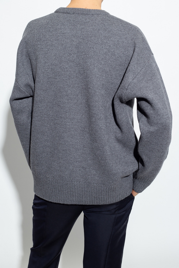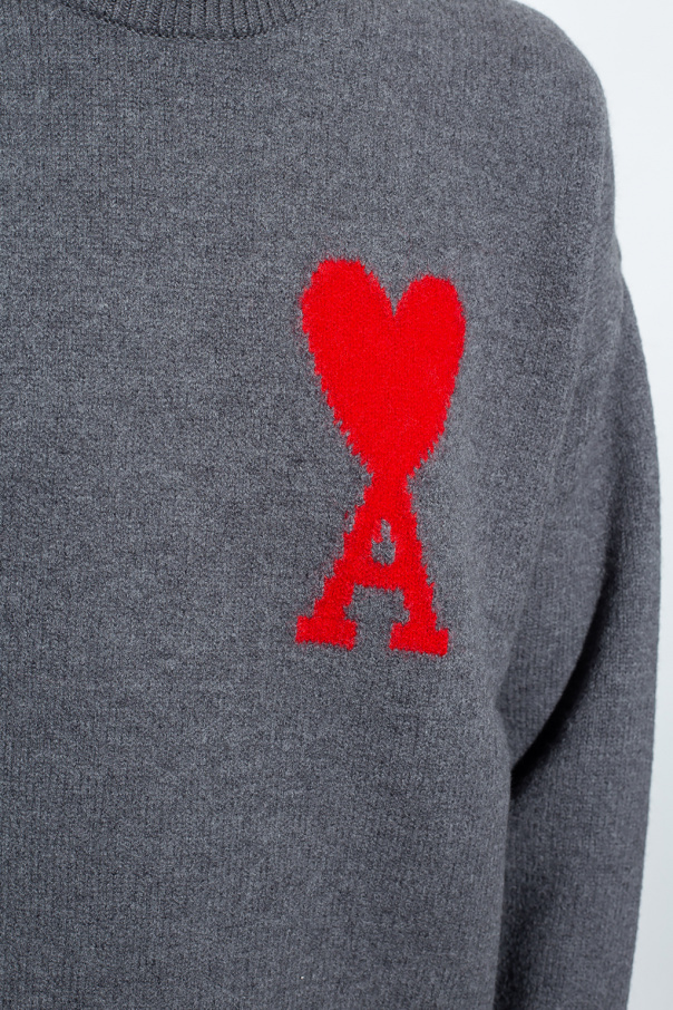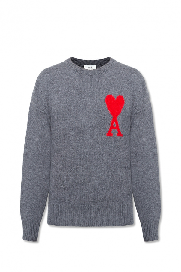 Grey crewneck sweater from Ami Alexandre Mattiussi. Made of wool, this style showcases a red logo graphic and elasticized trims on the collar, bottom hem and cuffs.