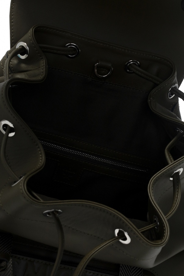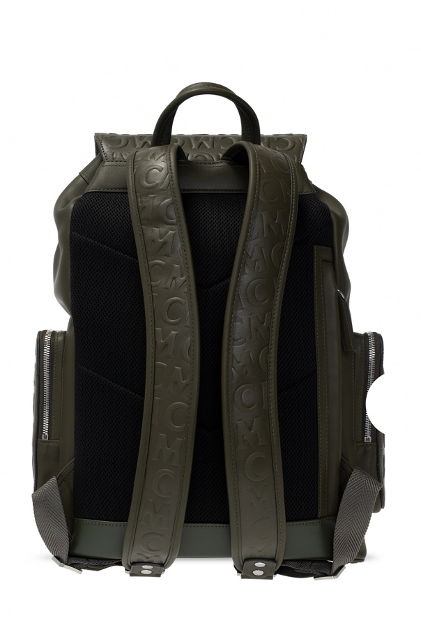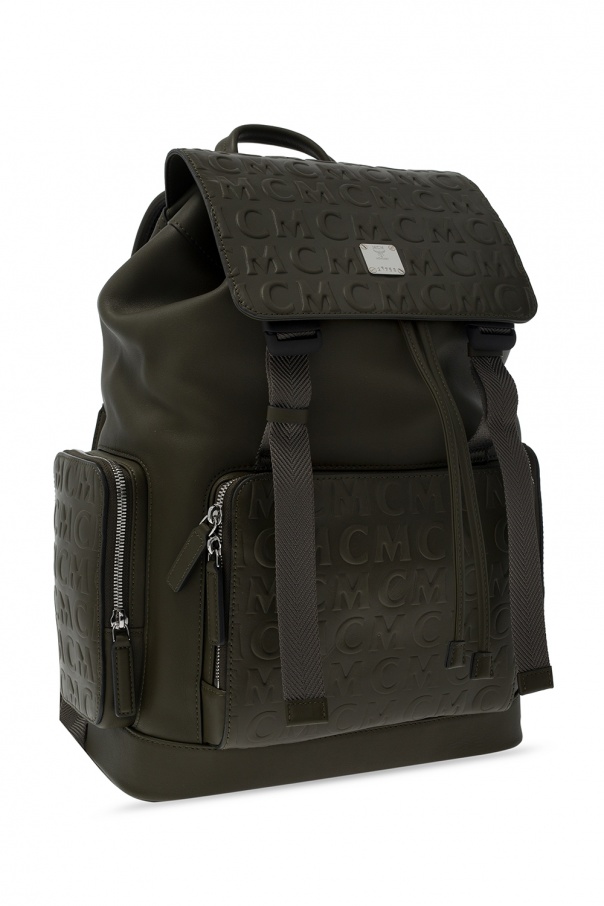 Green backpack from MCM. Trimmed with leather, this design features drawstring and buckle strap fastenings as well as embossed and metal logo detail. It is complete with four zip pockets, a half-round handle, adjustable shoulder straps, silver-tone metal hardware and one internal compartment with one zip pocket.