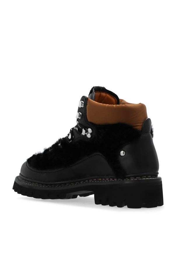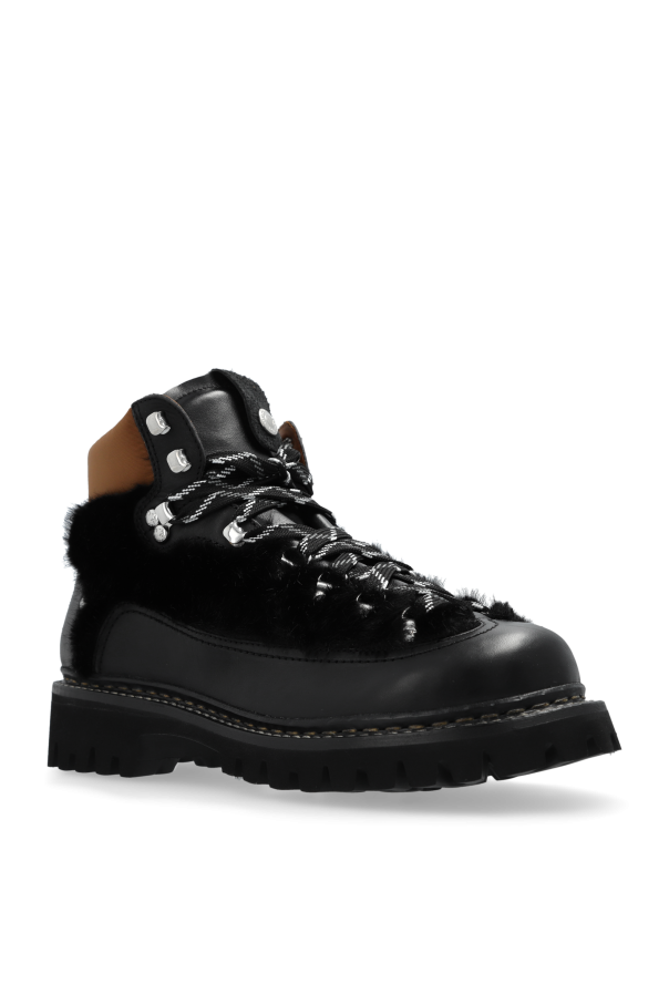 Introducing the Canadian Leather Boots by Dsquared2, an epitome of rugged sophistication. Crafted with meticulous attention to detail, these black men\'s boots blend luxurious leather with high-end design elements, making them an impeccable choice for the discerning gentleman. The upper portion of the boots is a harmonious amalgamation of premium black leather and fur-like material, accentuated by a brown trim that enhances their aesthetic appeal. A robust, thick sole with a pronounced tread ensures optimal traction, perfect for navigating winter terrains with ease. The boots feature a distinctive lacing system, comprising metal eyelets and hooks, exuding a trekking-inspired allure. The two-tone black and white laces provide a striking contrast, further elevating the sophisticated look. Intricate metal rivets on the sides not only fortify the structure but also add a touch of industrial chic. Inside, the designer\'s logo graces the insole, a subtle affirmation of the boots\' exclusivity. The high shaft extends above the ankle, offering additional support and protection, all while maintaining an elegant, outdoor aesthetic. Why Choose These Boots? Exquisite combination of black leather and brown accents Durable thick sole with excellent grip Stylish two-tone laces and metal eyelets High shaft for added support and protection Distinctive designer logo on the insole