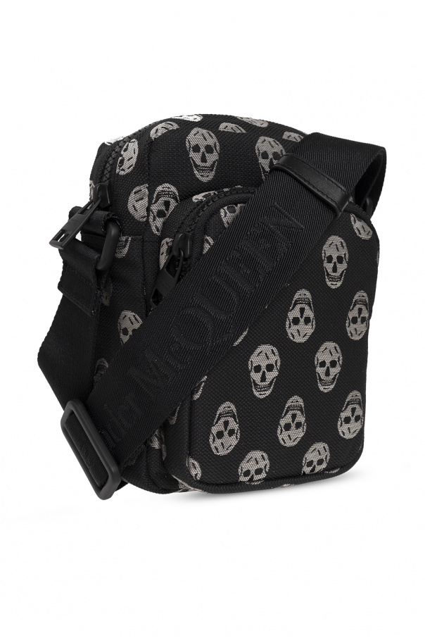 Black ‘Urban Messenger Mini’ shoulder bag from Alexander McQueen. This model features a front zip pocket, embroidered Biker Skull pattern in grey, back pocket, adjustable shoulder strap embroidered with a logo pattern and one internal compartment with one card slot.