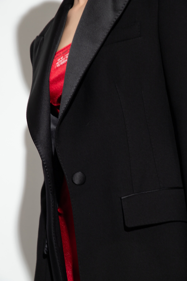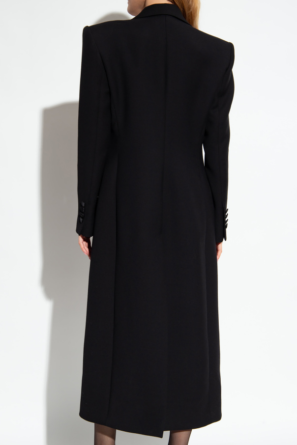 Black coat from Dolce & Gabbana. Made of a wool and silk blend, this style fastens with buttons and features peak lapels, padded shoulders, one welt pocket, two flapped pockets, long sleeves, and a single back vent.