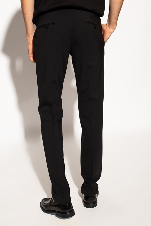 Black pleat-front trousers from Dolce & Gabbana. Crafted from wool, this pair falls down with slightly tapered legs and is complete with a zip fly and button, four front pockets and two buttoned back pockets.