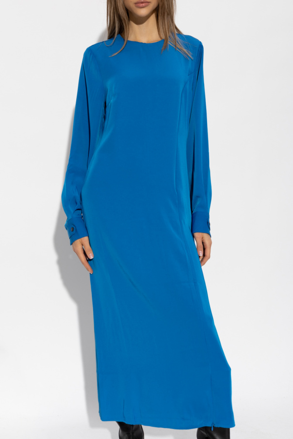 Dark blue ‘SloanGZ’ dress from Gestuz. Crafted from recycled material, this style features a round neck, a hidden back zipper, long sleeves with button cuffs and the below-the-knee length with a zippered high slit.