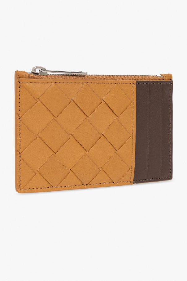 Brown card case from Bottega Veneta. Crafted from calf leather with the brand's iconic Intrecciato weave, this design features an embossed logo, three card slots and one zip coin pocket.