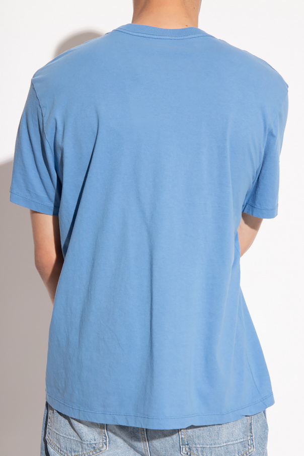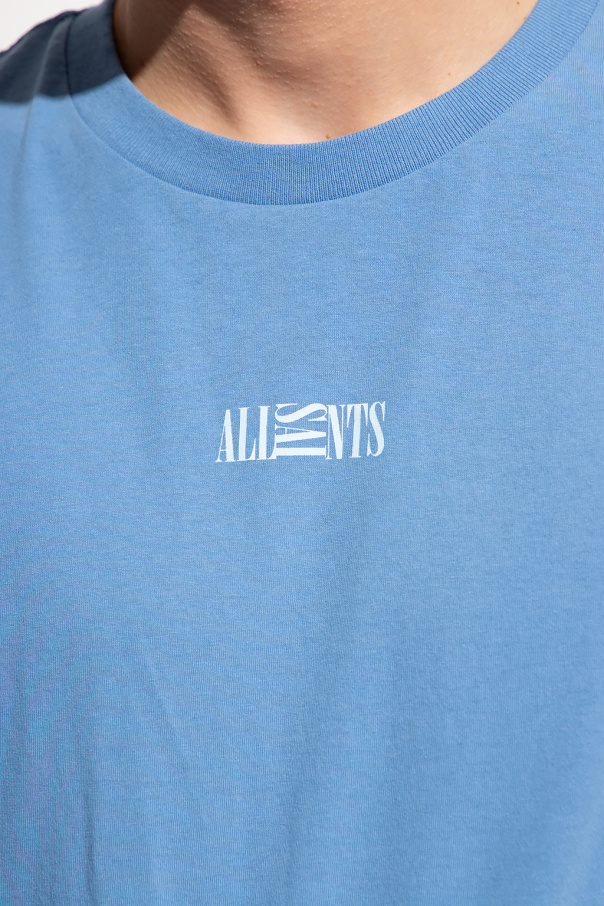 Blue ‘Opposition’ T-shirt from AllSaints. Made of cotton, this style features short sleeves, an elasticated collar and a blue graphic print with the brand\'s logo.