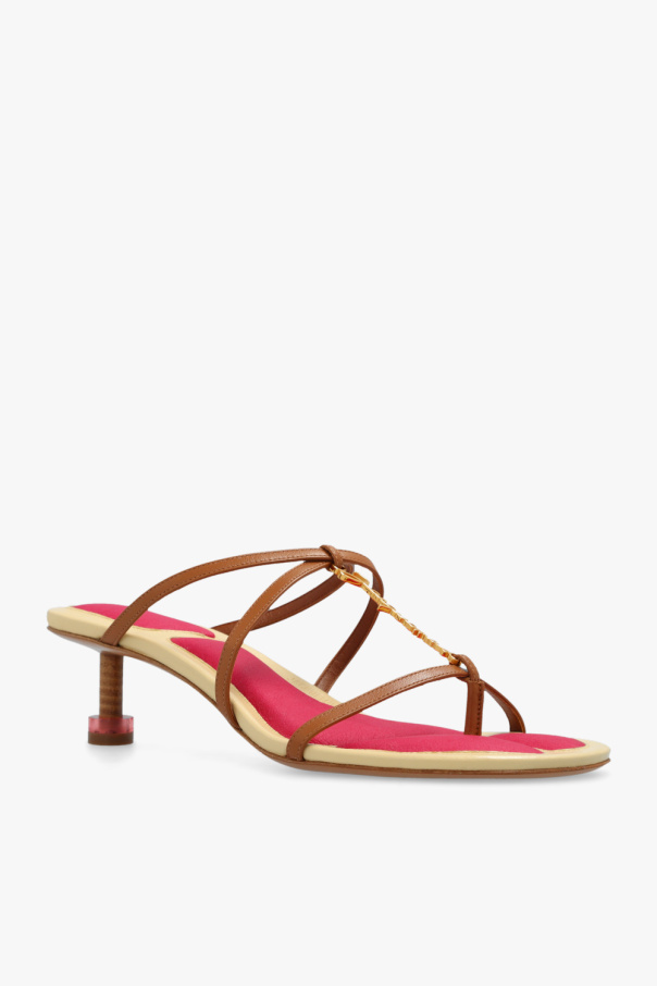 Brown ‘Pralu’ heeled mules from Jacquemus. Made of leather, this pair features a metal logo detail in gold-tone, contrasting cushioned insole, rounded toe, decorative heel and beige leather sole.