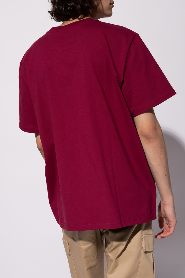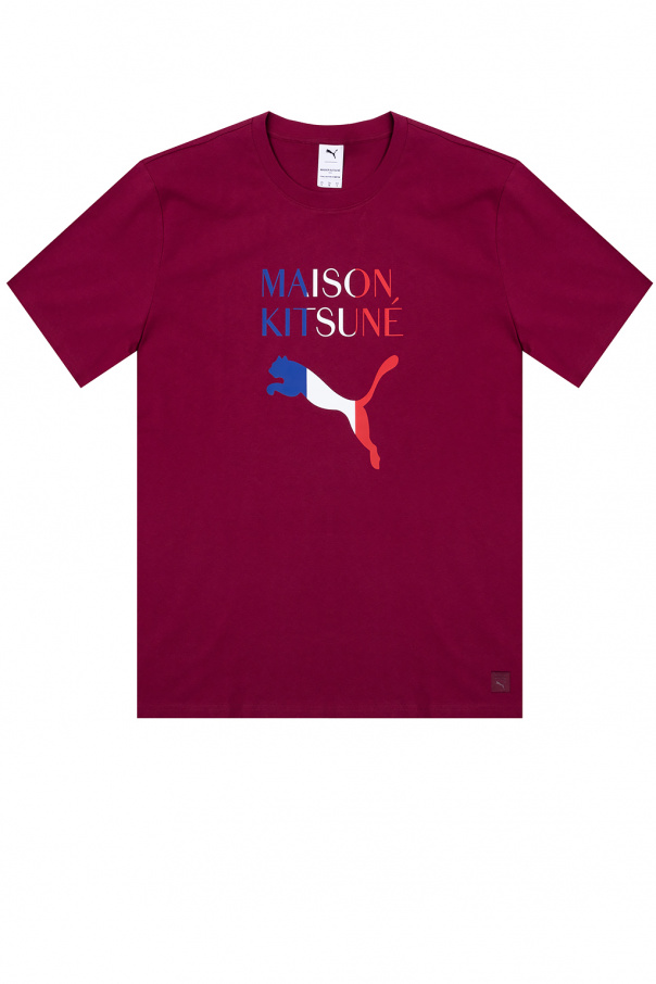Maroon crewneck T-shirt from Puma x Maison Kitsune. Crafted from cotton, this style showcases a blue, white and red logo print that refers to the colours of the flag of France where Maison Kitsune was created.