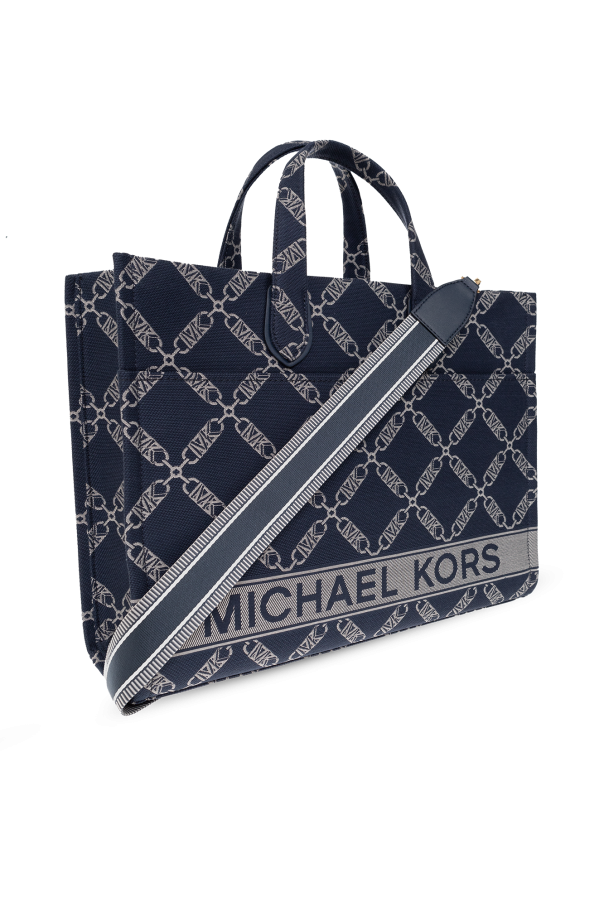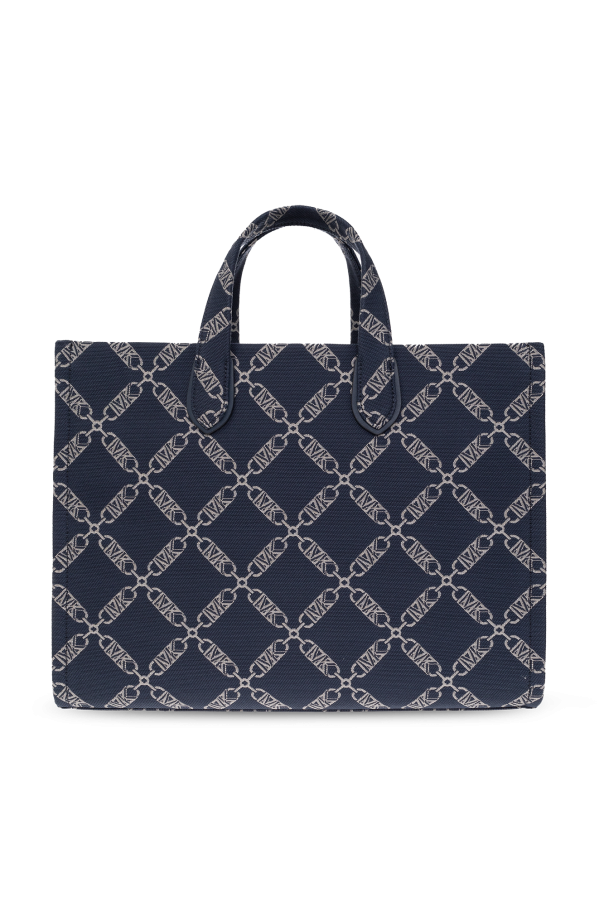 Navy blue and cream shopper bag from Michael Michael Kors. Crafted from fabric, this design showcases a decorative jacquard logo pattern. It is complete with a detachable shoulder strap, two half-round handles, gold-tone metal hardware and one internal compartment with two slip pockets and one zip pocket.