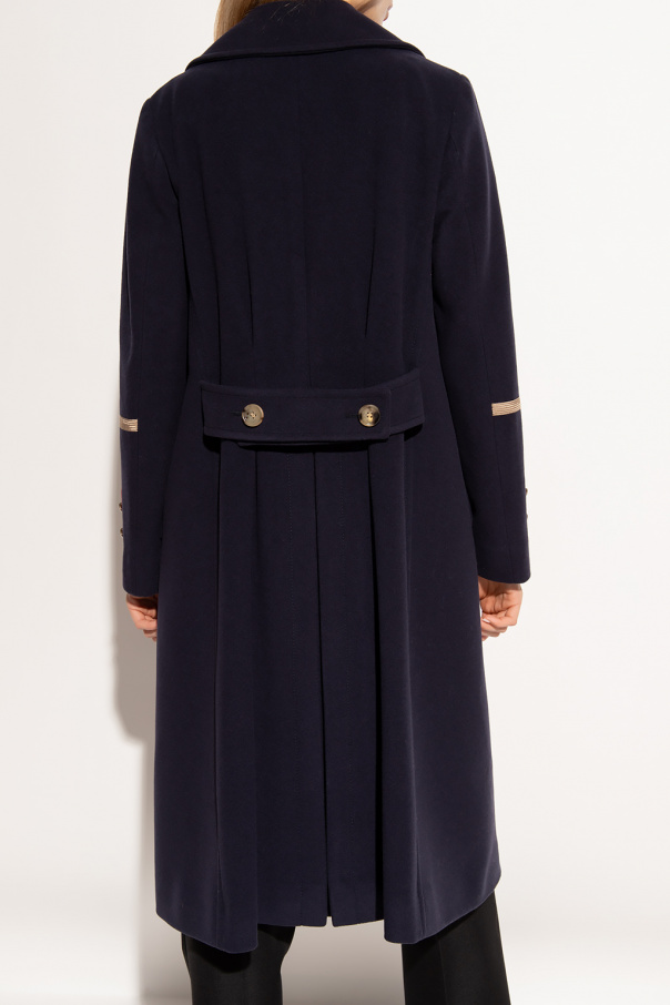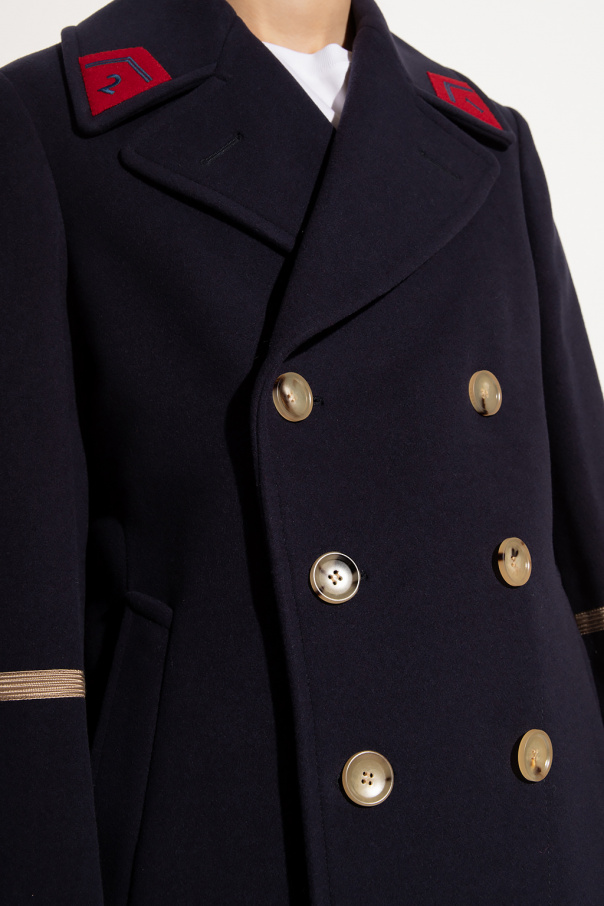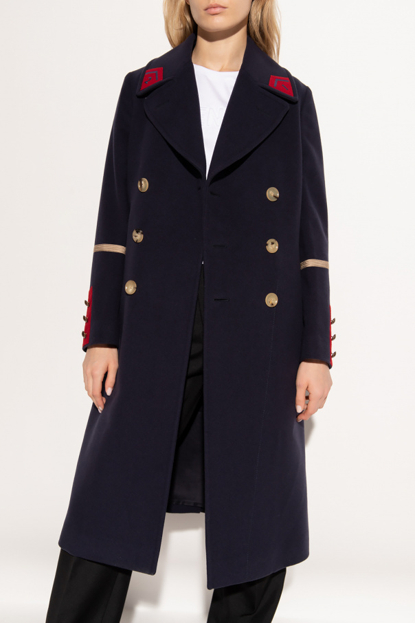 Navy blue coat from Gucci. Crafted from a wool and cashmere blend with a double-breasted silhouette, this style features button fastenings, distinctive red and beige details, two slip pockets and long sleeves.