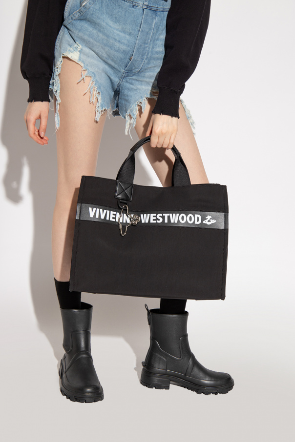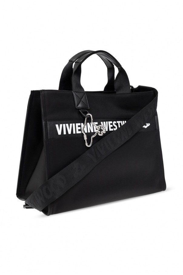 Black ‘Holborn’ shopper bag from Vivienne Westwood. Crafted from recycled material, this design fastens via a snap and showcases a branded stripe, two half-round handles, a detachable and adjustable nylon shoulder strap, an attached logo keyring, silver-tone metal hardware and one slip pocket and one snap-fastened pocket inside. 100% vegan product.