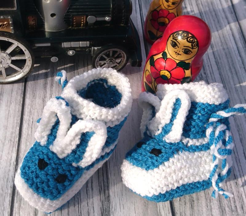 Размер подошвы 8-9 см, Но платочная вязка очень эластична, поэтому такие вязаные пинетки будут "подрастать" вместе в Вашим сыночком и дочуркой.