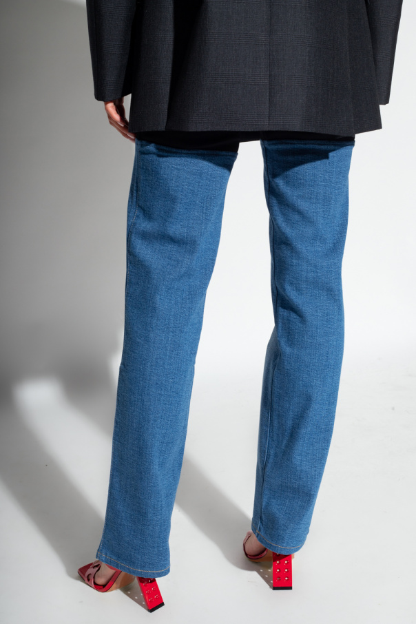 Black and blue high-waisted trousers from Alaia. Crafted from contrasting fabrics, this pair features an elastic waistband and straight legs.