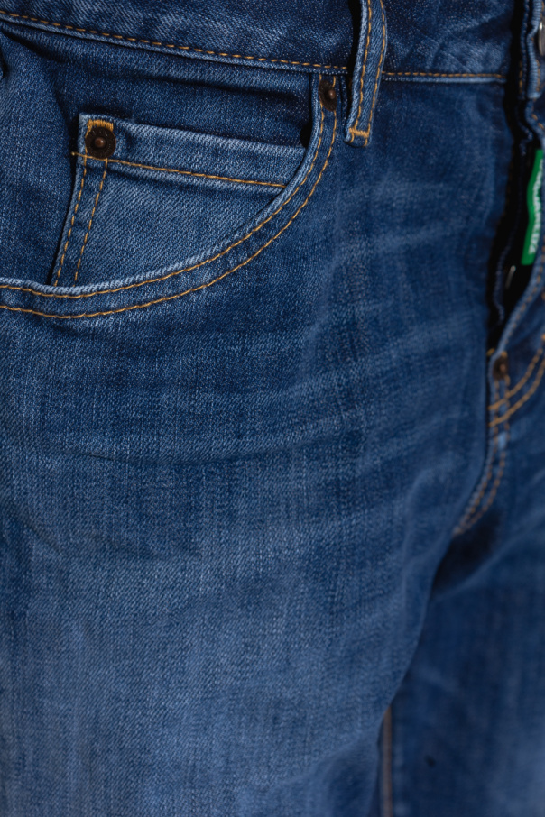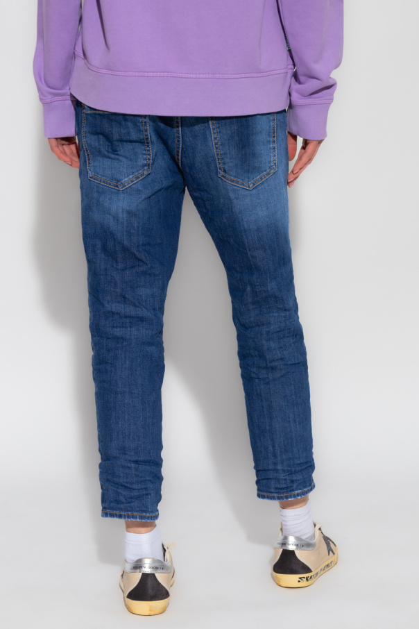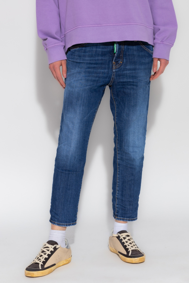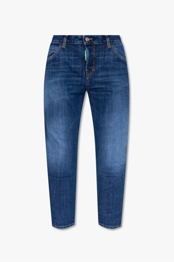 Navy Cool Girl Cropped’ jeans from Dsquared2, the ‘One Life One Planet’ collection. Fastened with buttons, this pair features button fastenings, contrasting beige stitching, green logo patches, five slip pockets and cropped legs.