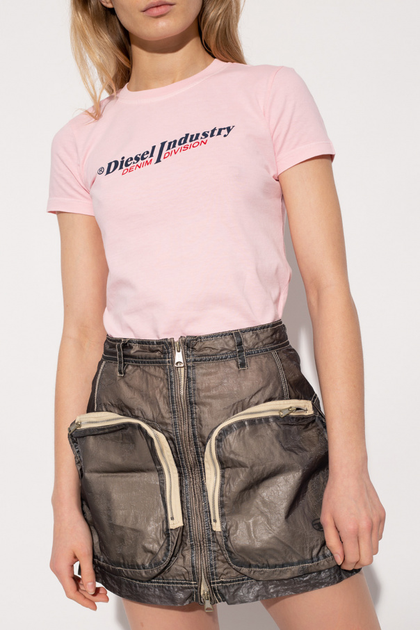 Pink ‘T-Sli’ crewneck T-shirt from Diesel. Made of cotton from sustainable farms, this style features short sleeves and a navy blue and red graphic print with the brand\'s logo on the front.