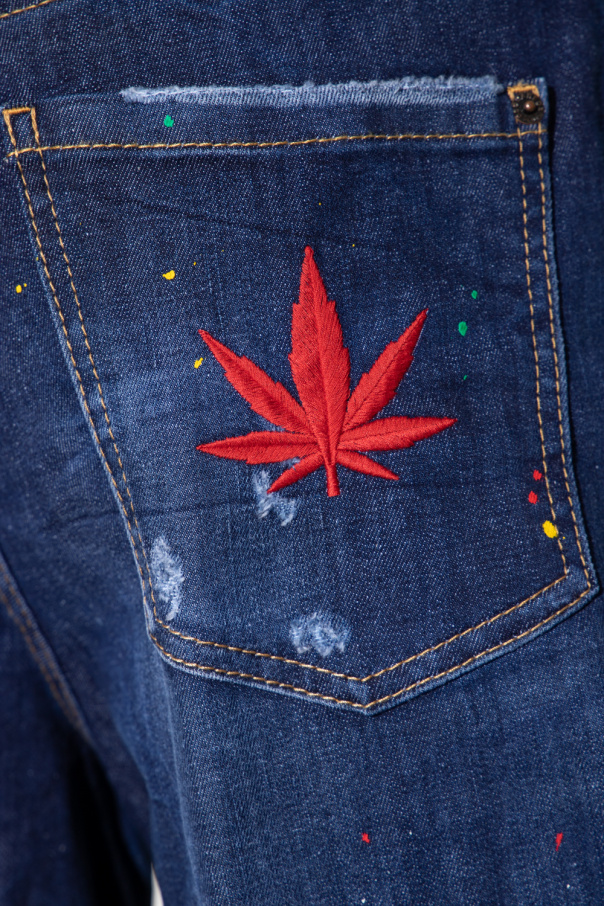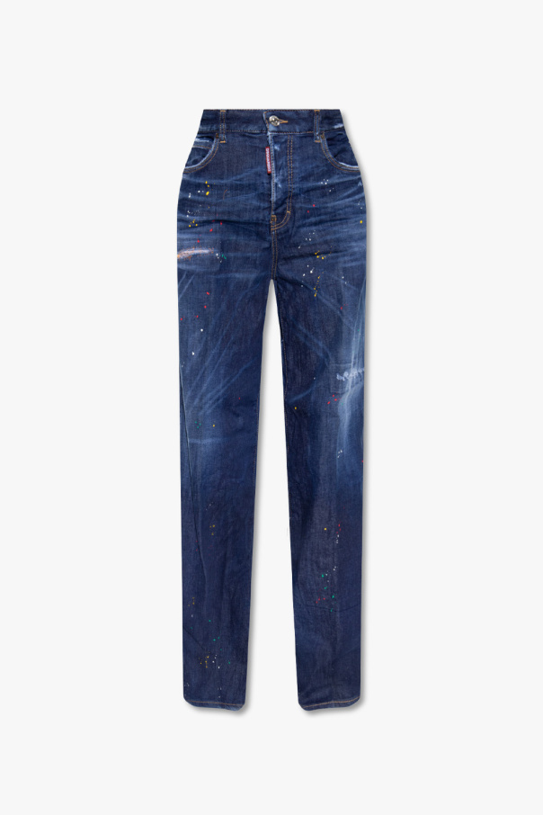Navy blue ‘Traveller’ jeans from Dsquared2. Made of cotton with a vintage effect, this pair falls with wide legs and features button fastenings, classic five pockets, colourful patches and paint splatters.