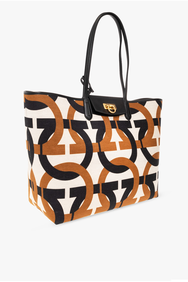 Cream shopper bag from FERRAGAMO. Made of a linen and wool blend, this model features a decorative Gancini closure, black and brown logo motif, half-round leather handles, leather trimming and one internal compartment with a removable pouch.