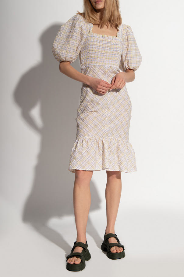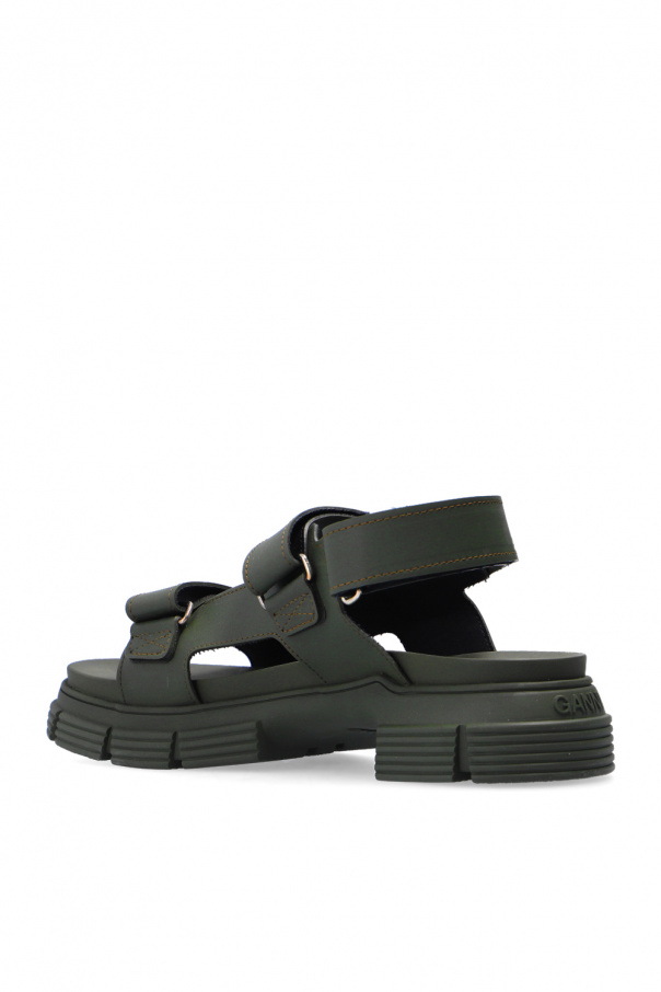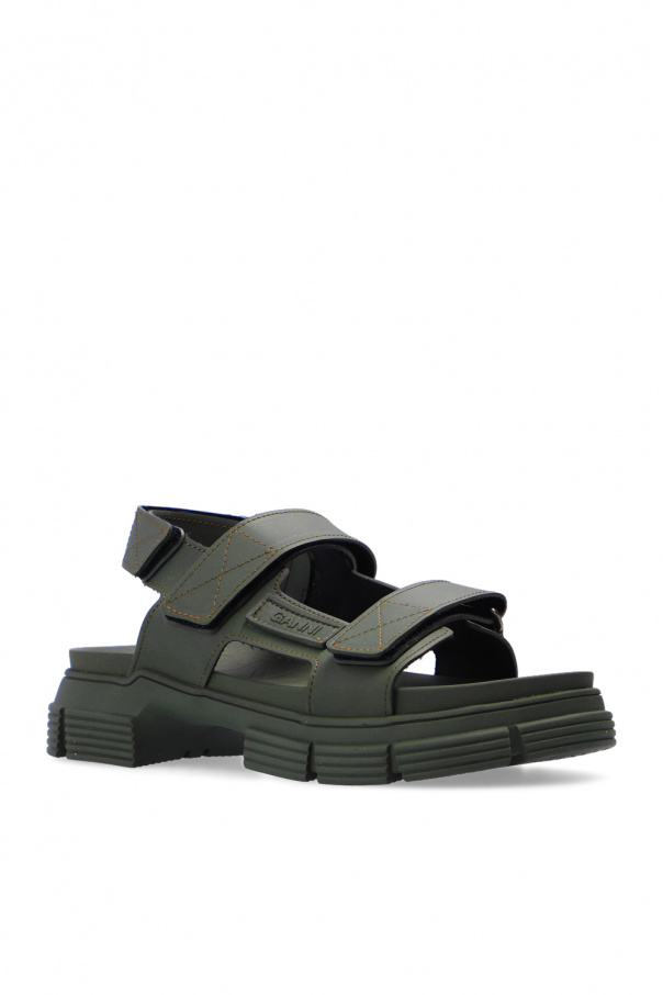 Green sandals from Ganni. Crafted from recycled rubber, this pair sits on a green rubber sole and features three straps adjustable via velcro, a patch with a tactile logo and silver-tone metal hardware.