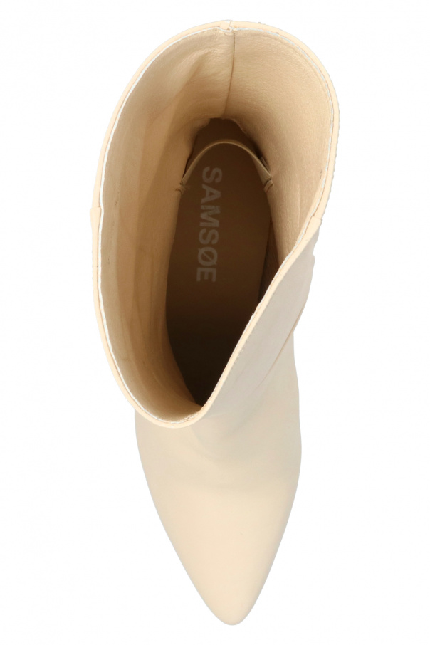 Cream heeled ankle boots from Samsoe Samsoe. Crafted from leather with a pointed toe silhouette, this pair sits on a black rubber sole.