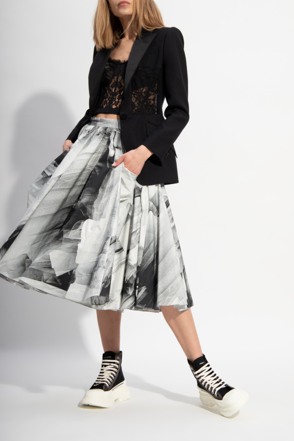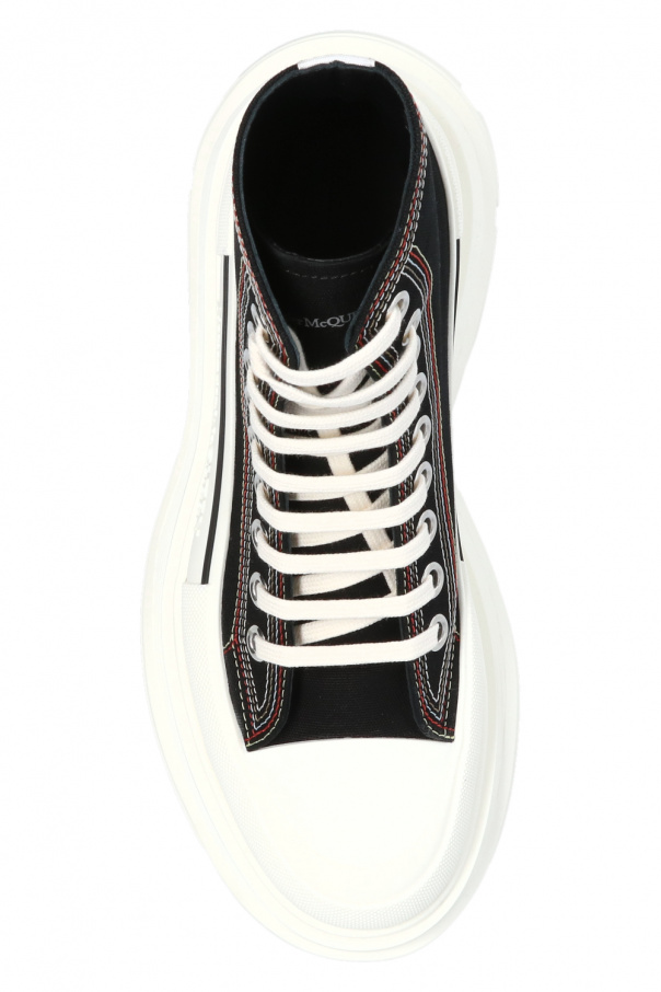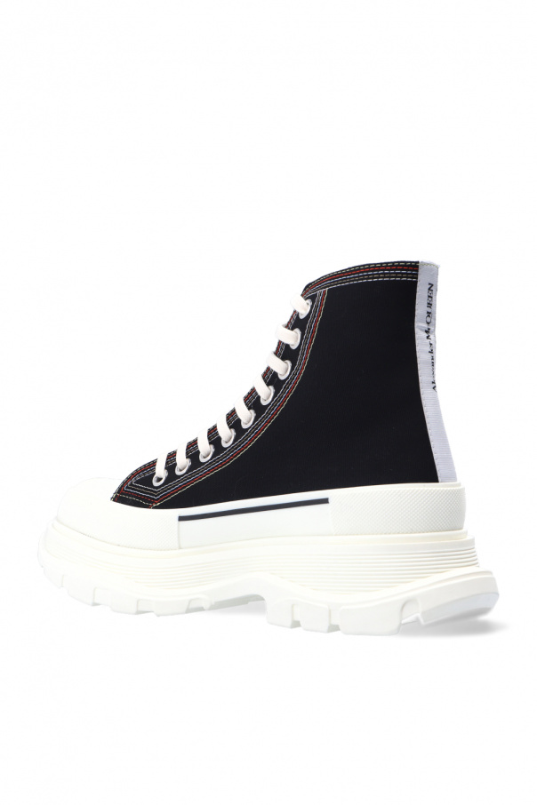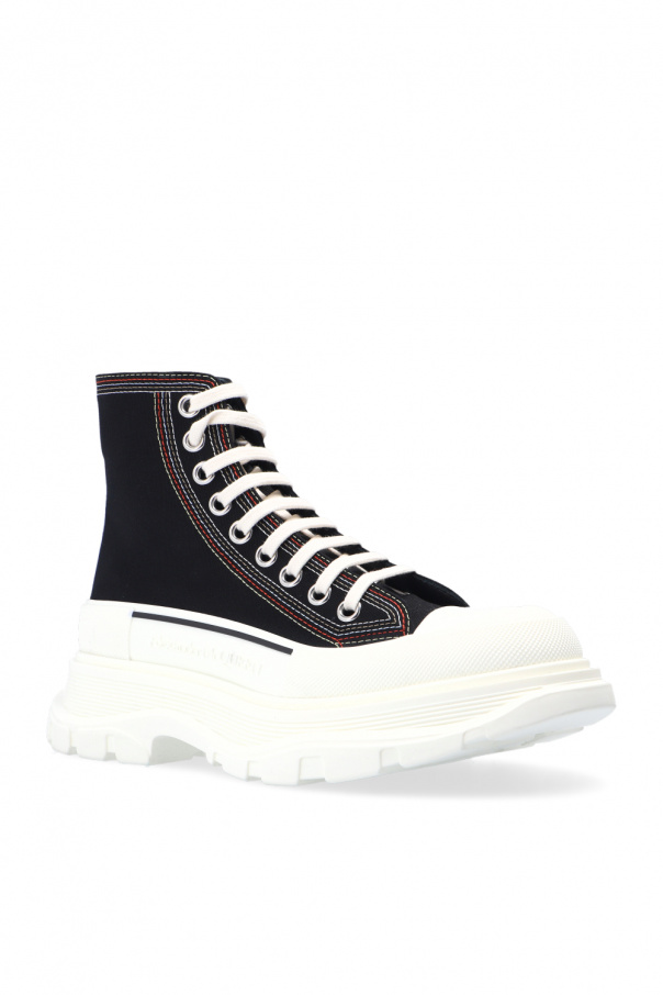 Black and white sneakers from Alexander McQueen. Set on a white rubber sole, this lace-up pair is enriched by a logo embroidery, raised logo detail and multicolored stitching details.