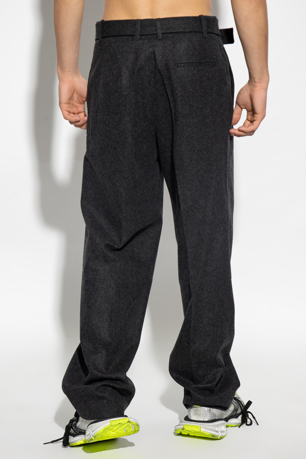 Dark grey trousers from Etudes. Made of wool, this pair falls with straight legs and features a zip fly with a hook, a buckle belt, front pleats, a silver-tone plaque with an engraved logo as well as three pockets: two on the front and one at the back.