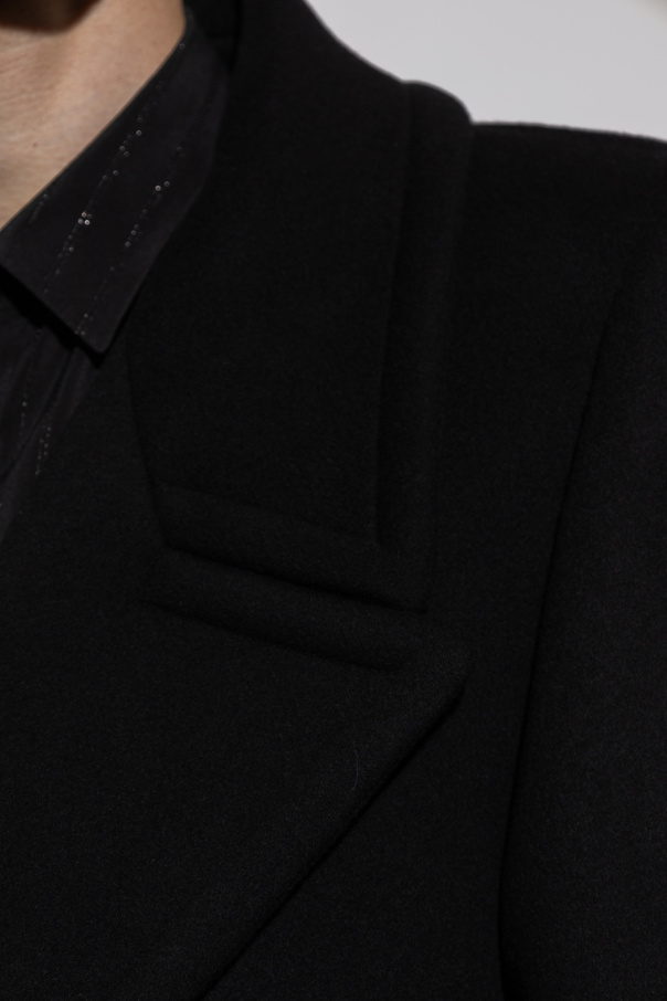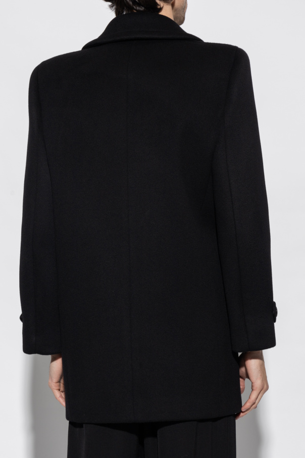 Black coat from Saint Laurent. Made of wool with a double-breasted, short silhouette, this style features a silk lining, peak lapels, button fastenings, one welt pocket, two flapped pockets, and long sleeves.