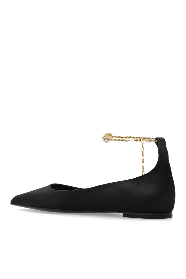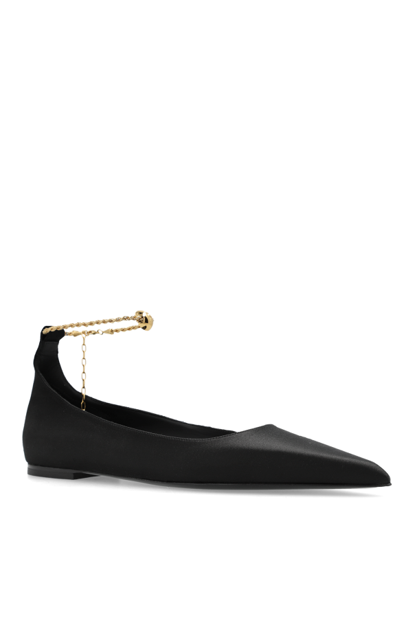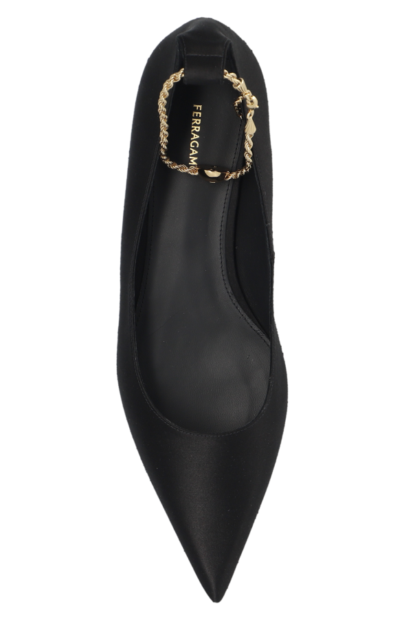 Black ‘Dada’ ballet flats from FERRAGAMO. Made of fabric and leather, this pair features a decorative ankle chain with a lobster clasp closure, pointed toe, black leather sole and regular width insole.