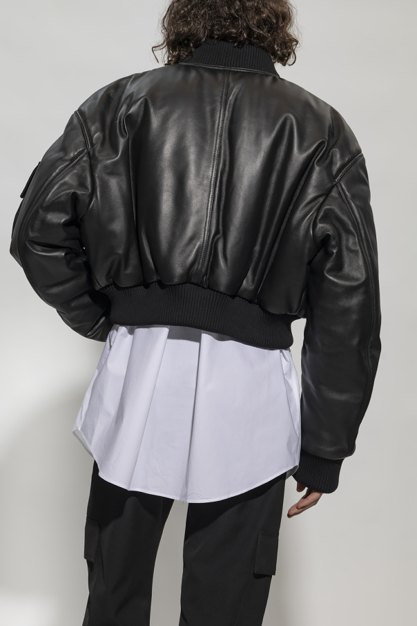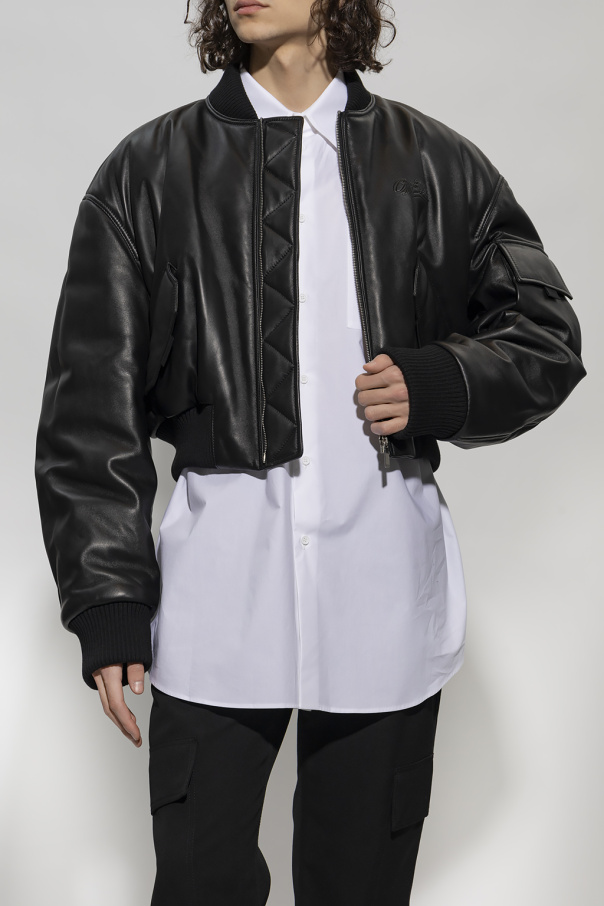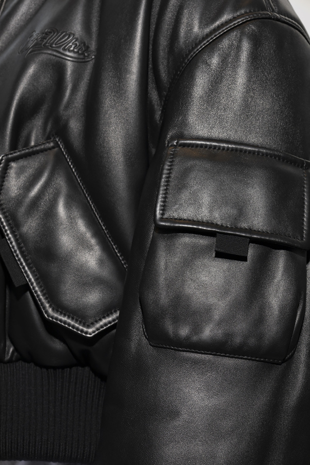 Black jacket from Off-White. Crafted from leather, this style fastens with a zipper and showcases a logo pattern. It is complete with two flapped pockets and elasticized trims on the standing collar, bottom hem and cuffs.