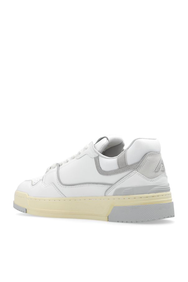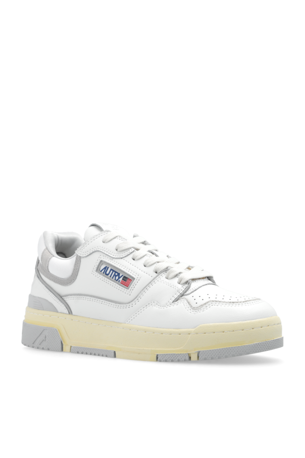 White and grey ‘CLC’ sneakers from Autry. Made of leather and fabric, this lace-up pair sits on a cream and grey rubber sole and is enriched by a logo and perforations.