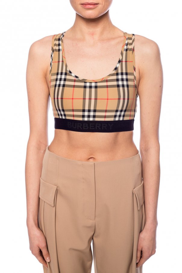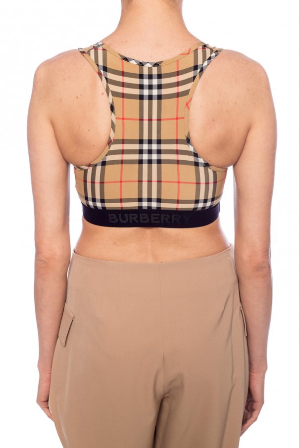 Beige, black and red cropped top from Burberry featuring signature check print and black elastic hem with branding.